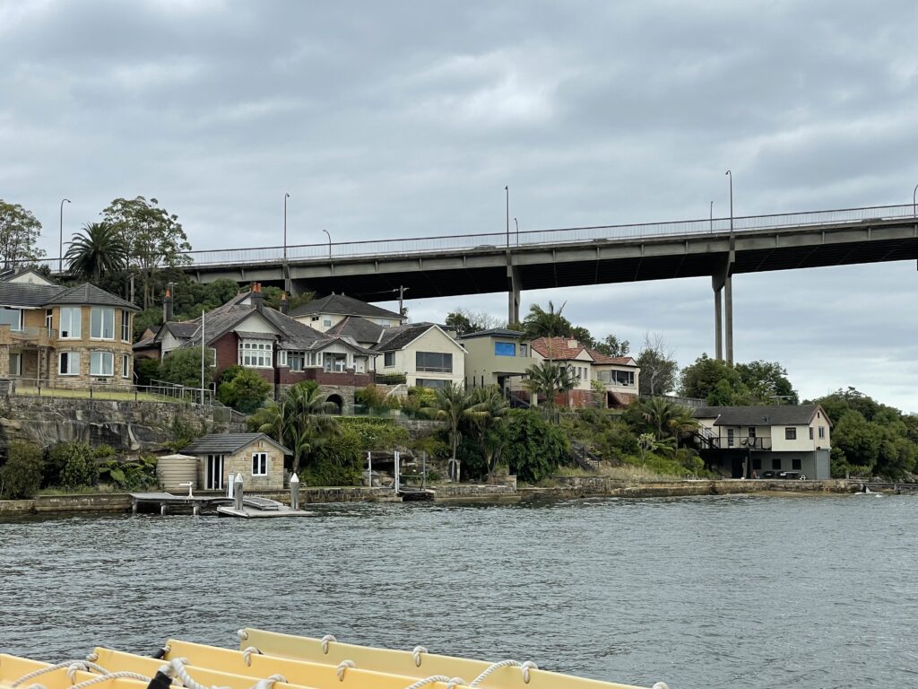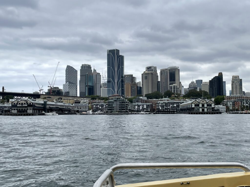 Det blev en dejlig tur, hvor vi fik et godt indtryk af, hvor stort et område metropolen breder sig over. Der er 23 km til Parramatta, som er det næststørste forretningsområde i metropolen. Det betyder, at der pludselig når man kommer ned af floden rejser sig en ny højhusby på et sted, hvor man ikke ville have forventet det. Turen fra city og derned var kendetegnet ved en stor variation i byggerierne. Fra Citys mange stilsikre højhuse til store områder, der bedst kan karakteriseres som villaområder langs Strandvejen (de har rigelig Strandvej i Sydney skulle vi hilse og sige). Andre steder igen var der tætte beboelsesområder med huse på 10-12 etager, f.eks. i den tidligere olympiske landsby, som vi også kom forbi. Men dejligt at sidde i brisen på dækket og suge til sig af synsindtrykkene.