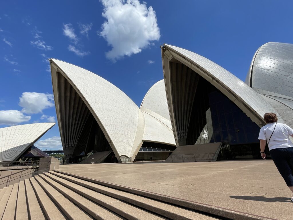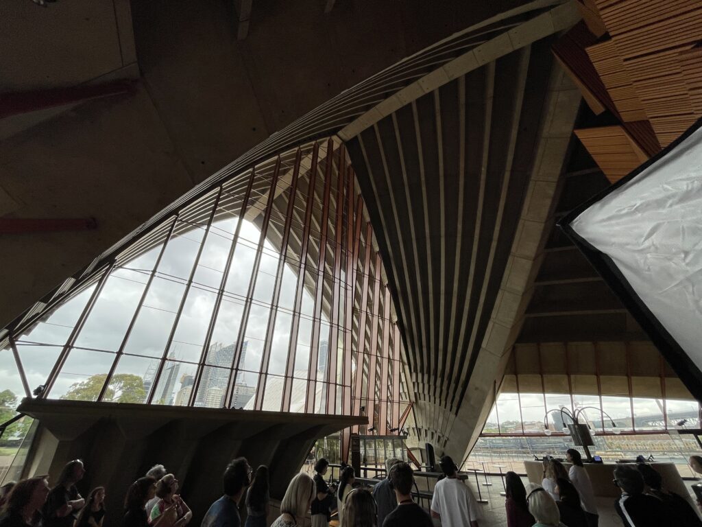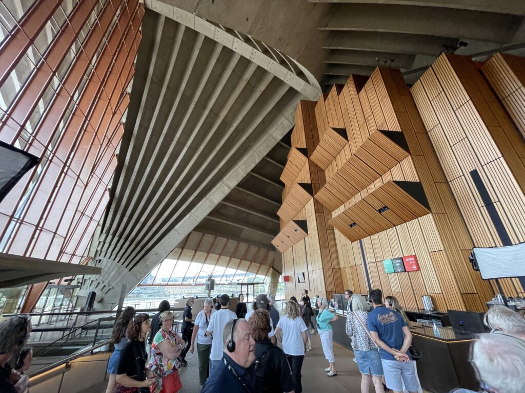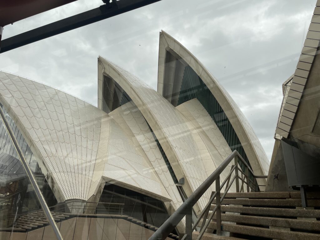 Dagen startede med en guidet tur rundt i operahuset. Det er et betagende bygningsværk – især udefra, hvor formgivningen er unik og vildt spændende. Det fortælles, at Utzon vandt arkitektkonkurrencen i 1957 på sit skitseprojekt, men grundlæggende ikke anede, hvordan det skulle opføres. Så byggeteknikken blev udviklet undervejs i et samarbejde med Arup ingeniørerne. Utzon tillægges dog æren for det konstruktive princip, hvor husets dele er samlet af forskellige cirkeldele med varierende radier. Det ses tydeligt, når man er indenfor. Huset er bygget på en platform af to eller flere etager, hvorpå de to koncertsale er lagt ved siden af hinanden under de kendte tage.