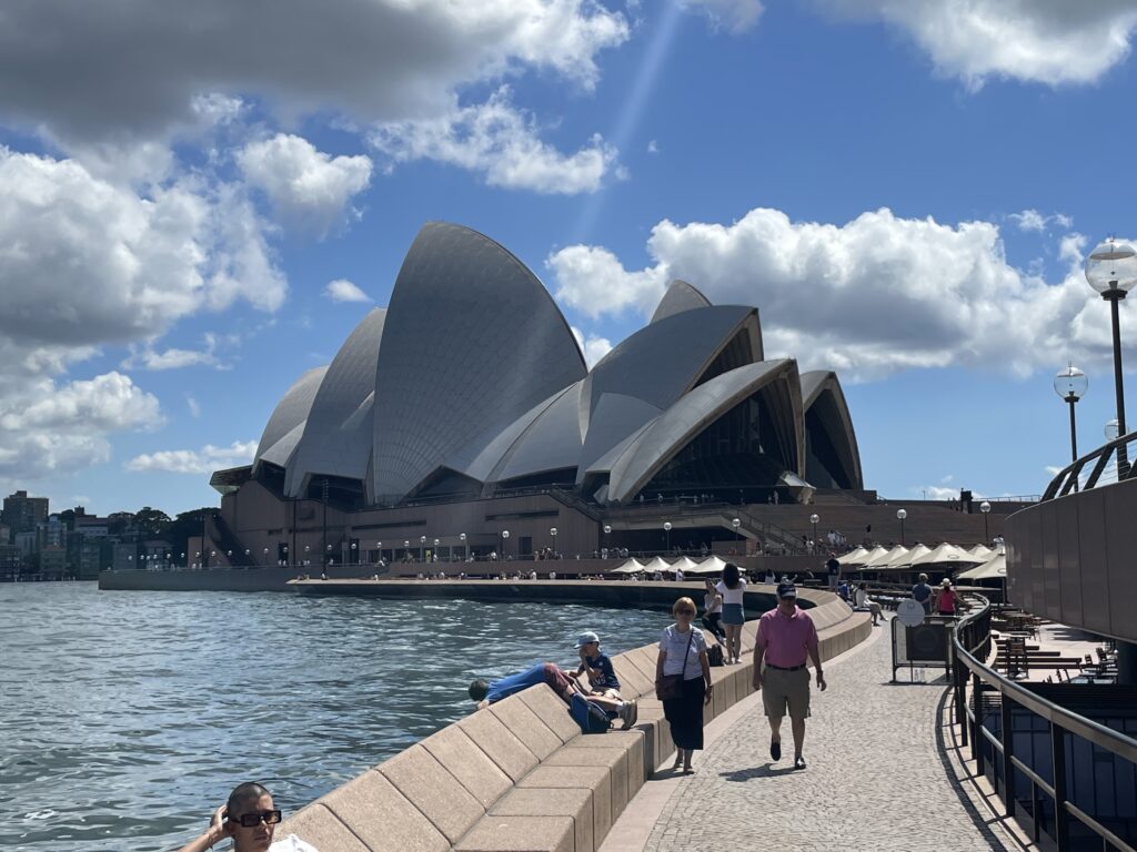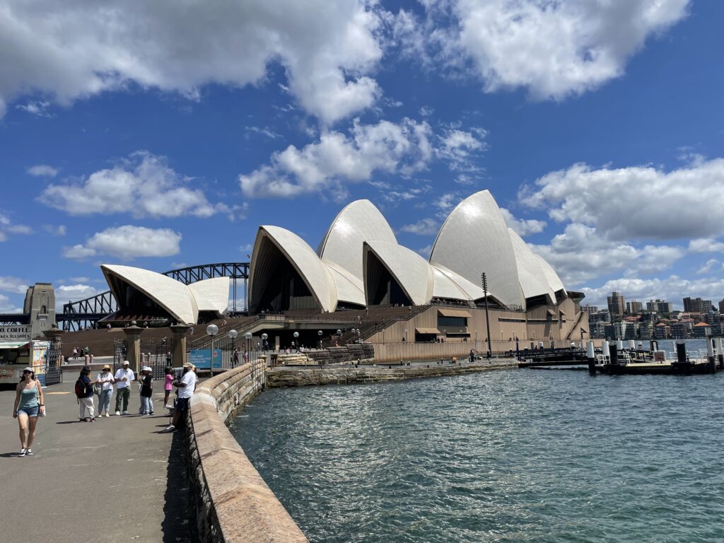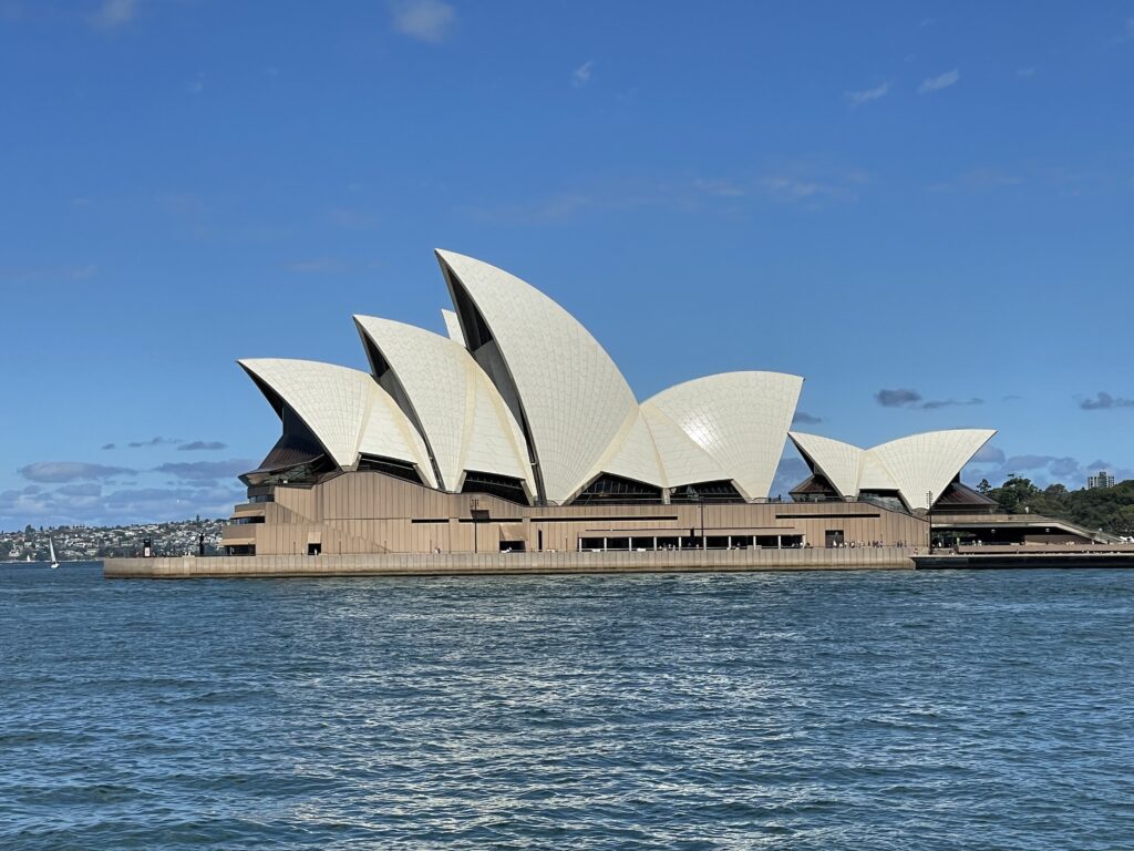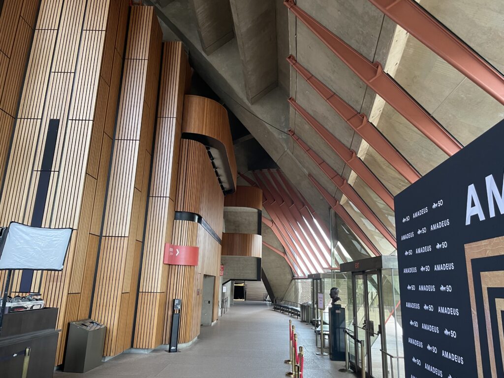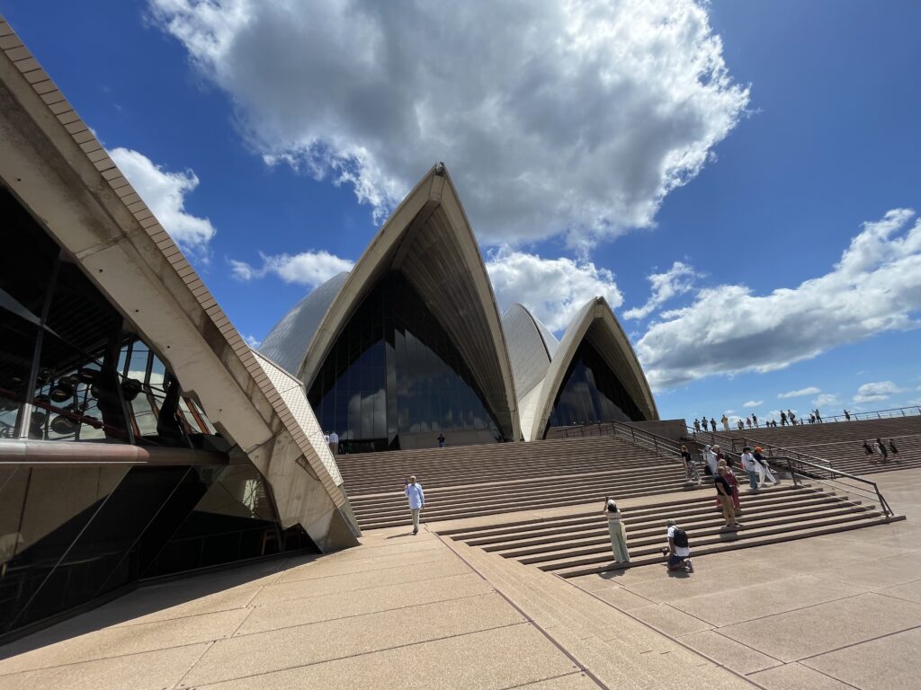 Dagen startede med en guidet tur rundt i operahuset. Det er et betagende bygningsværk – især udefra, hvor formgivningen er unik og vildt spændende. Det fortælles, at Utzon vandt arkitektkonkurrencen i 1957 på sit skitseprojekt, men grundlæggende ikke anede, hvordan det skulle opføres. Så byggeteknikken blev udviklet undervejs i et samarbejde med Arup ingeniørerne. Utzon tillægges dog æren for det konstruktive princip, hvor husets dele er samlet af forskellige cirkeldele med varierende radier. Det ses tydeligt, når man er indenfor. Huset er bygget på en platform af to eller flere etager, hvorpå de to koncertsale er lagt ved siden af hinanden under de kendte tage.