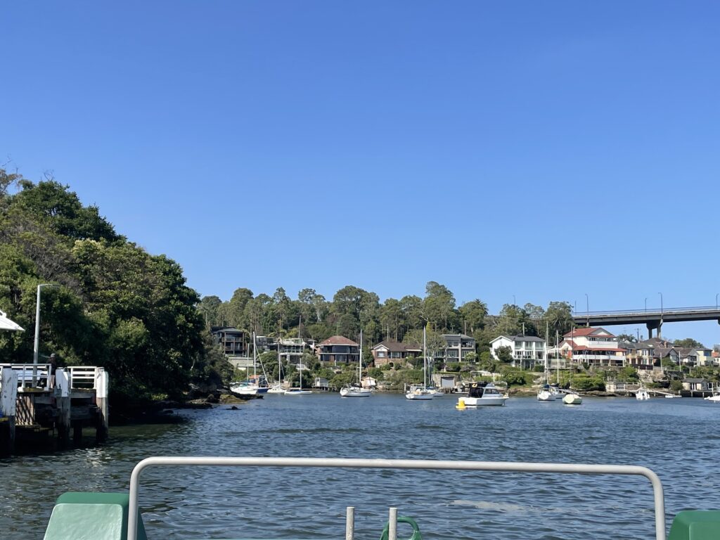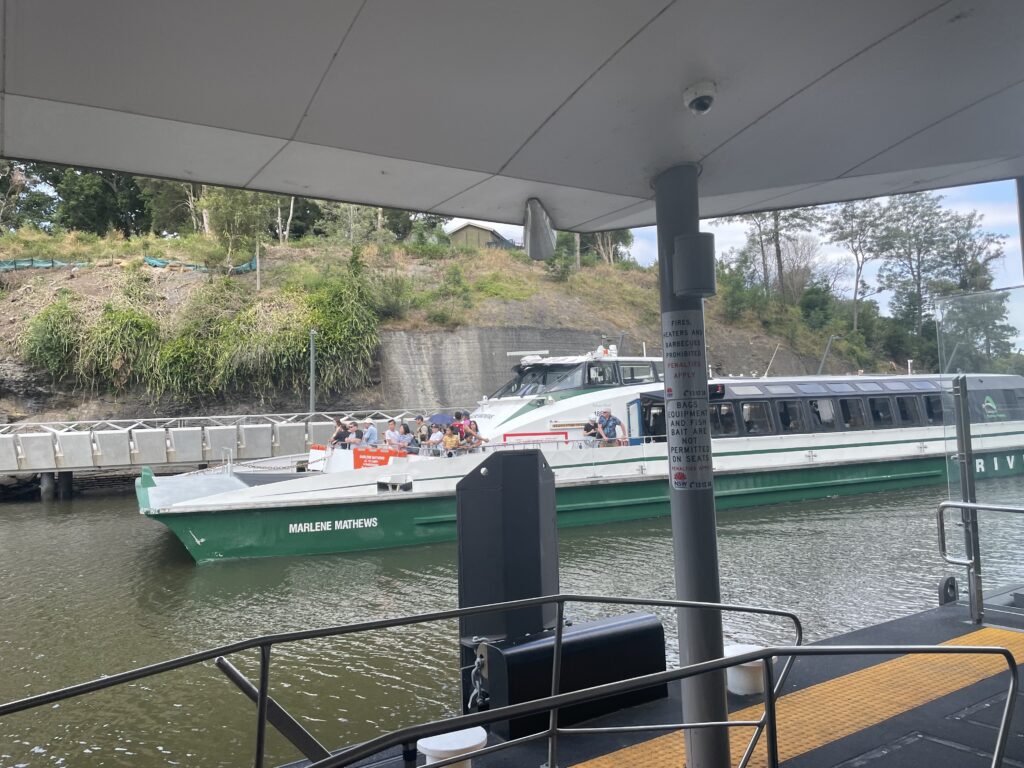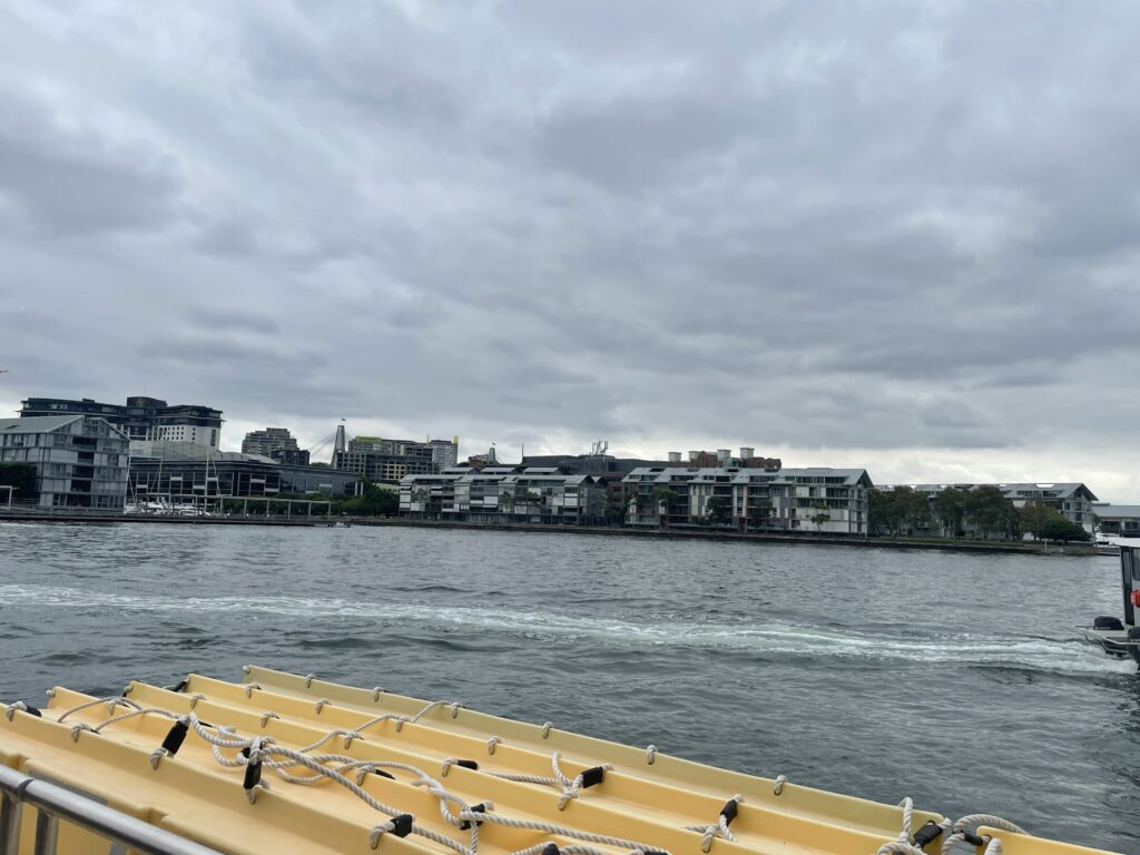 Efter besøget havde vi aftalt at tage en tur med en af Sydney mange havnebusruter. Vi valgte den længste tur til Parramatta. 90 minutter hver vej for 50 kr. pr. billet. Havnebusserne er en del af det offentlige transportsystem, så man bruger bare det rejsekort, vi havde skaffet os – og fået tanket op med det nødvendige beløb.