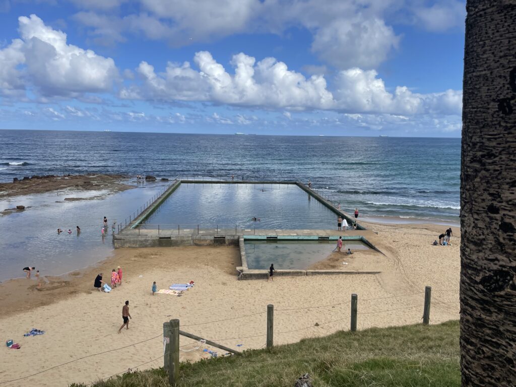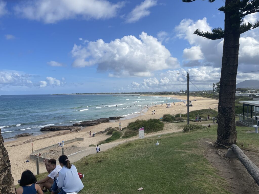 Fra golfklubben kørte vi langs vandet tilbage mod huset. Vi stoppede ved Bulli Strand. Her var bare hyggeligt. Australien har jo sommerferie for tiden, og der er mange mennesker ved alle strandene. Da der er masser af bademuligheder, så virker det ikke så overrendt, som det kan forekomme derhjemme, f.eks. i Rørvig. Men det er tydeligt at børnefamilierne hygger sig. Klokken var ca. 17 da vi tog billederne.