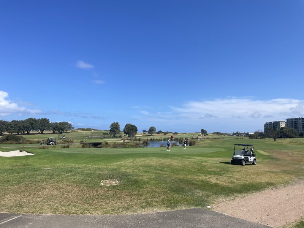 Banen er i øvrigt en links bane. Jeg har ingen idé om, hvor svær den er, men det er tankevækkende, at man her kan spille greenfee i primetime for 200 kr. Vi skal så leje et golfsæt og enten buggy eller trolley oveni – men det er nu noget anderledes priser end derhjemme.
