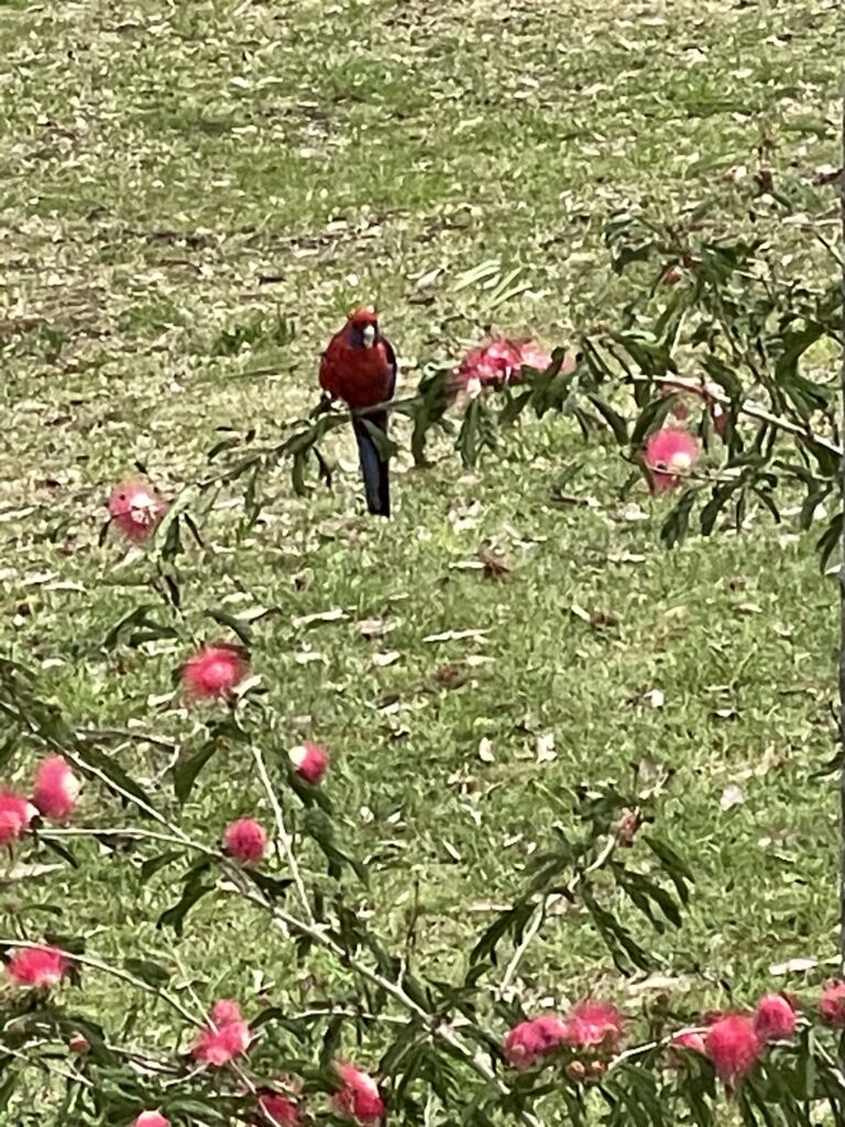 Bagefter tog vi hjem til Sheenagh og Andys terrasse, hvor vi fik fornøjelsen af at høre kakaduerne samles for aftenen i en gevaldig snakkende larm. Vi var enige om, at det må være lyden af Australien. Da de holdt en lille pause, kom de røde papegøjer på besøg. De kunne også snakke, omend knap så højt. Der var også en Honeysucker, der ville være med. Så det var hyggeligt at sidde og bare studere.