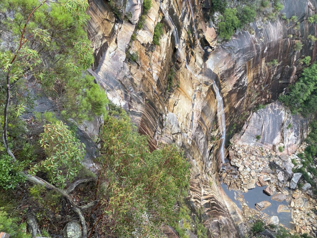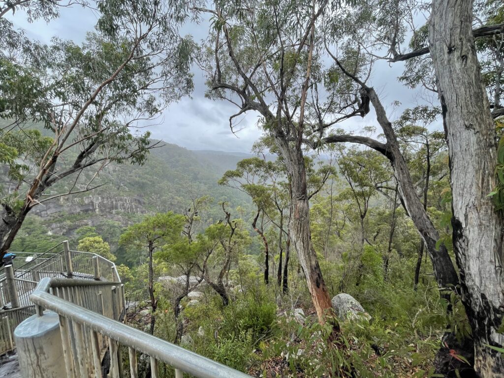 Efter frokost kørte vores værtsfolk os en tur, for da var regnen stoppet. Først til den lokale nationalpark, for at se et vandfald. Det var noget af en køretur ind i skoven, men fra parkeringspladsen skulle vi kun gå ca. 500 meter, så kom vi ud til vandfaldet og til dalen, hvor terrænet lige faldt 150 meter ned. Ikke lige min stil at vandre ude på kanten – men Birgit sagde at udsigten var flot – selvom det var dybt ned. Selvfølgelig skulle det lige til at regne igen, da vi kom derud. Så det gik relativt hurtigt tilbage til bilen igen.