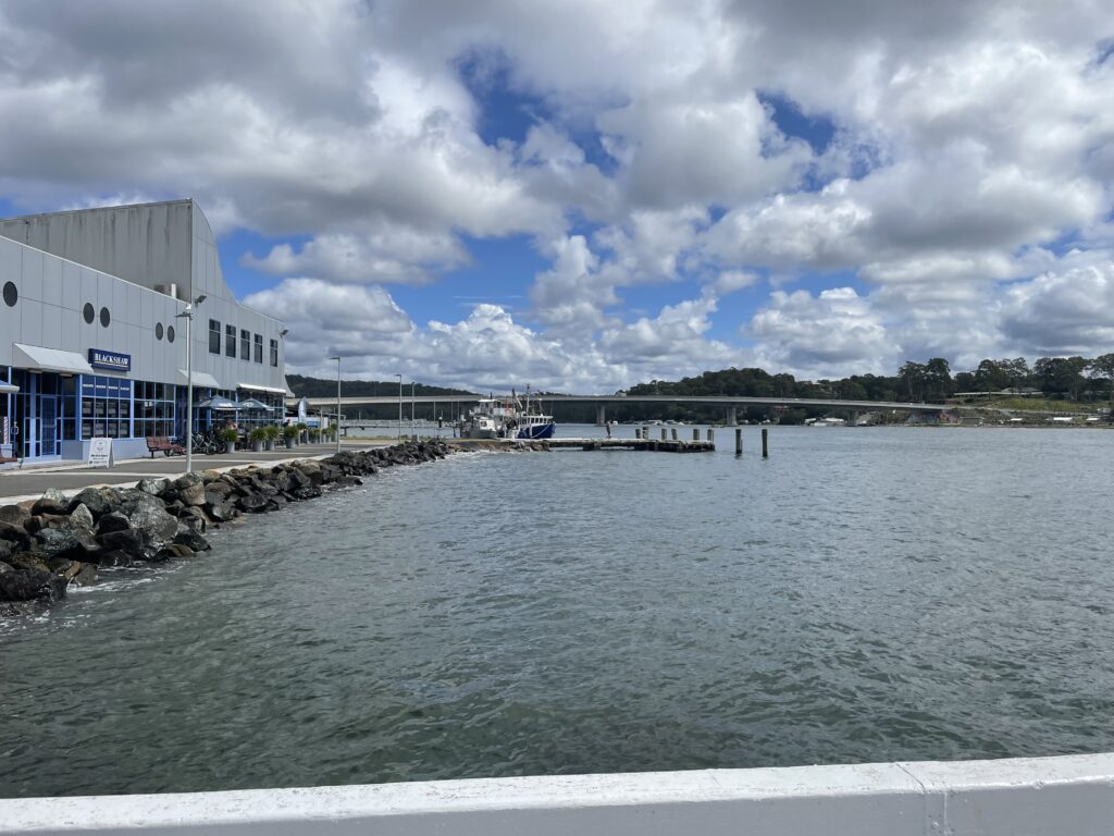 Vi havde besluttet, at dagens køretur skulle gå til Merimbula. En køretur på godt 200 km, når man som os tog kystruten. Vi startede med at køre til Batesmans Bay. Byen har en fortid som udskibningssted for tømmer og landbrugsvarer, der blev sejlet til Sydney. I 1959 fik man bygget en bro over floden Clyde, og siden er byen vokset til en mindre, lokal metropol. Den virkede meget hyggelig – så vi stoppede og kiggede på havnen. Birgit købte lidt sommertøj – og så fik vi en kop kaffe.