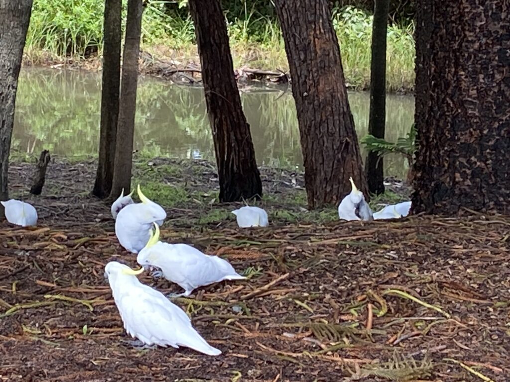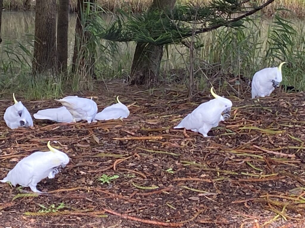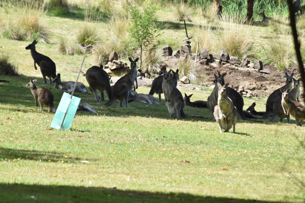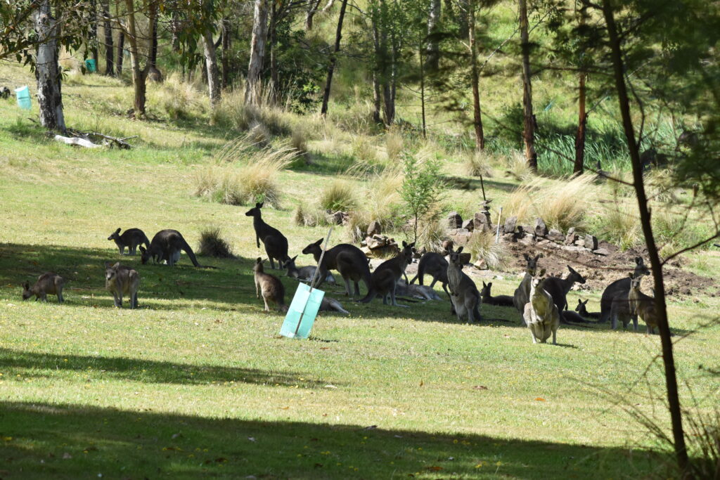 Fra Batesmans Bay søgte vi ud på de små veje langs vandet. Vi fik set en del dyr undervejs. Bl.a så vi denne flok kakaduer (Birgit talte 29), der spiste under et stort træ ved en rasteplads, og denne flok kænguruer, der havde fundet en græsplæne i skovkanten at slå sig ned på.
