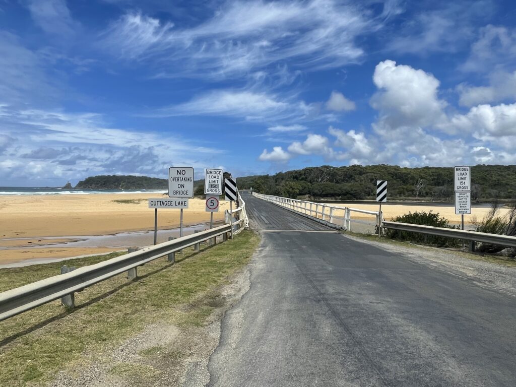 Naturen hernede er fantastisk flot. Hver gang man kommer omkring et hjørne, er der nye indtryk. Landskabet skifter hele tiden mellem skove, strande, klipper, enge. Men skoven er ikke bare skov. Nogle steder har den tydelige mærker efter brandene i 2020 – andre steder kan man se, at den har fået lov til at stå i mange år. Så er der en tæt underskov, og mange af de høje træer er bevokset med snyltere og slyngplanter, hvilket giver en hel anden oplevelse. På køreturen i dag kom vi forbi en lang række forskellige indsøer (Inlets) med større og mindre vådområder og strandenge. I formiddags var det ebbe, og derfor var strandområderne tørre. Flere steder er vejen over mundingen udført med en træbro i et spor. Så må man pænt vente på, at trafikken fra den anden side er afviklet. Her er det broen ved Cuttagee Lake, hvor man kun må passere med 5 km/t. Der var nu ikke nogen vi så, der tog det alvorligt.