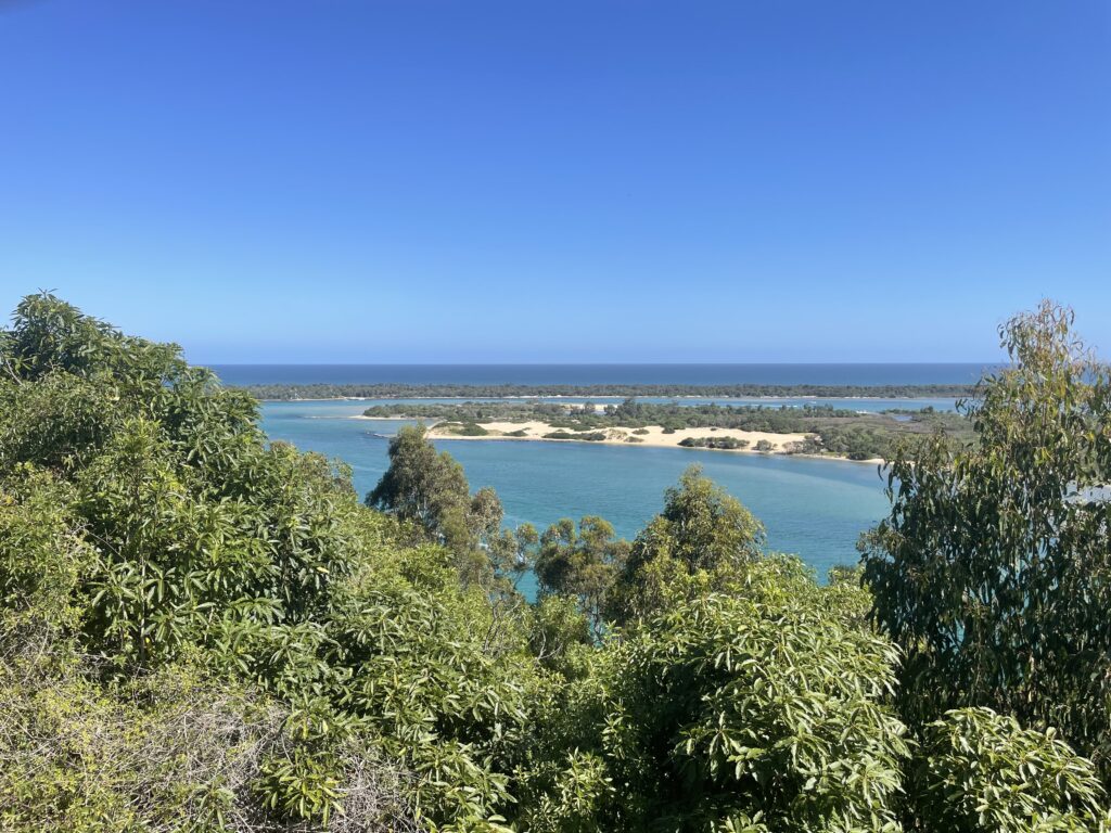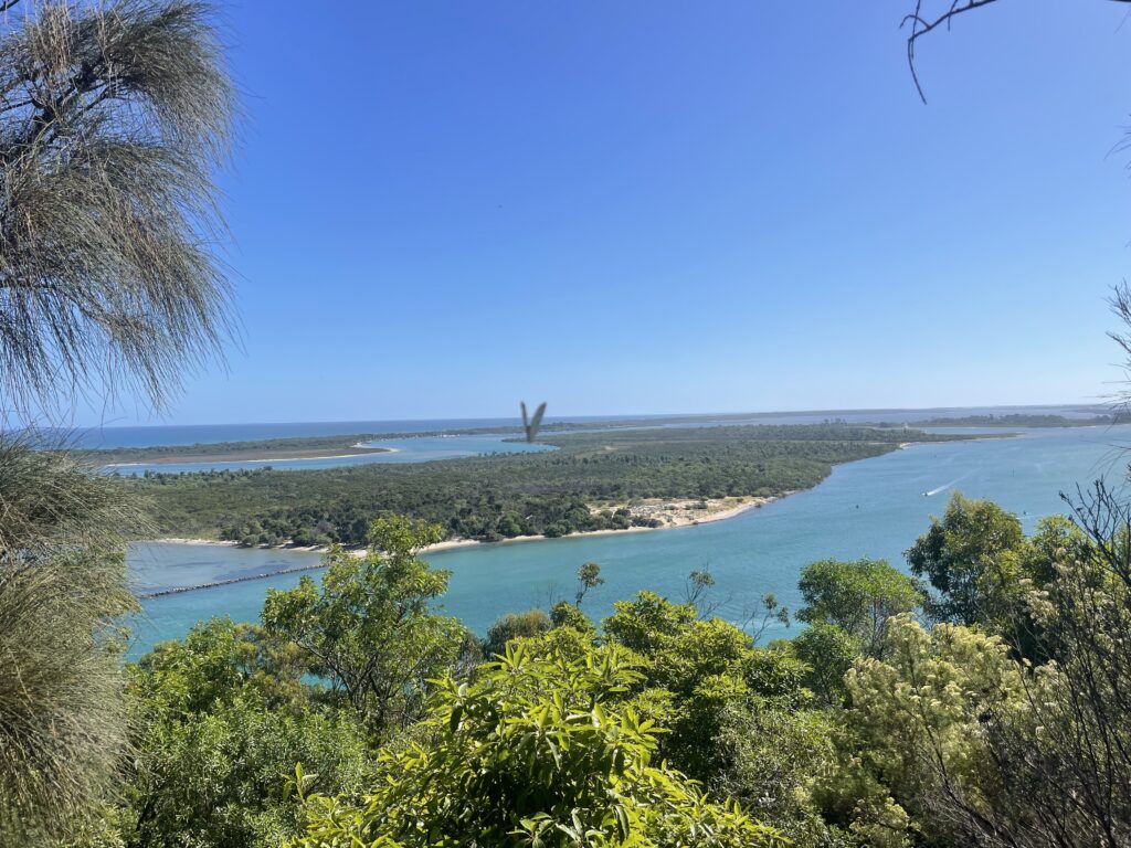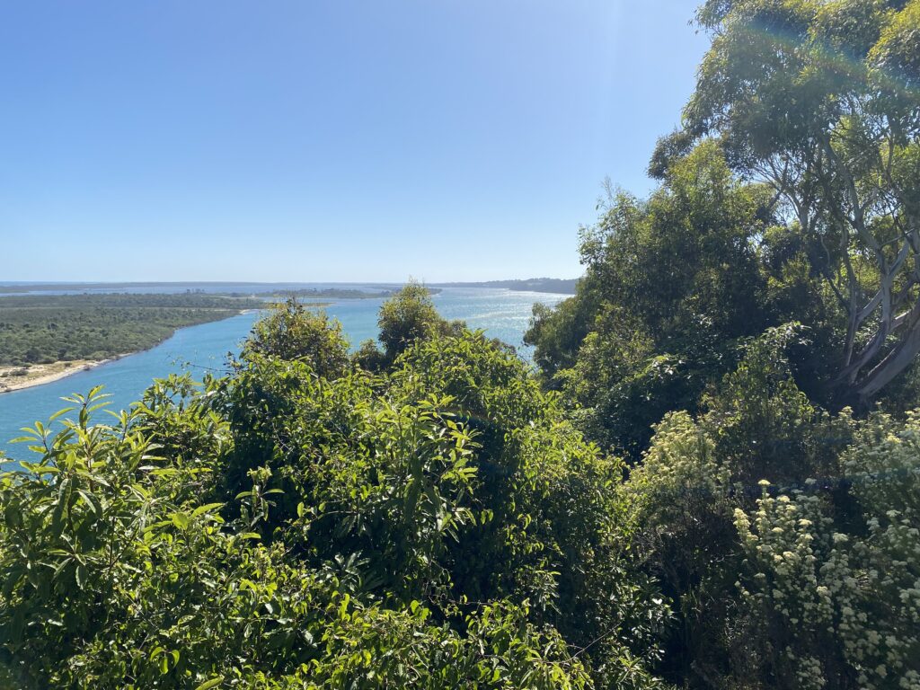 På vej tilbage til Lakes Entrance stoppede vi på et af udsigtspunkterne, hvor man kan se nedover vandområderne. Det er svært at vise på fotos, hvor smukt der er. Vandet er azurblåt, sandet hvidt og skoven er grøn. Men vi skal da gøre et forsøg: