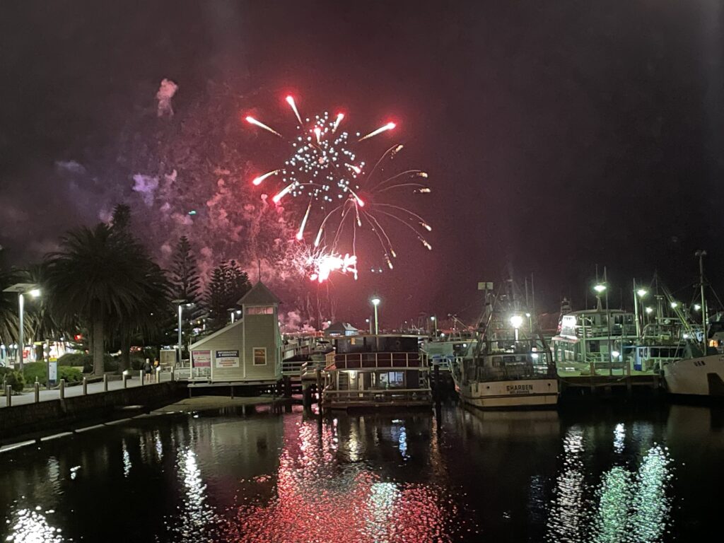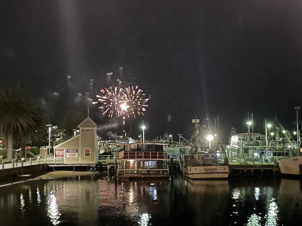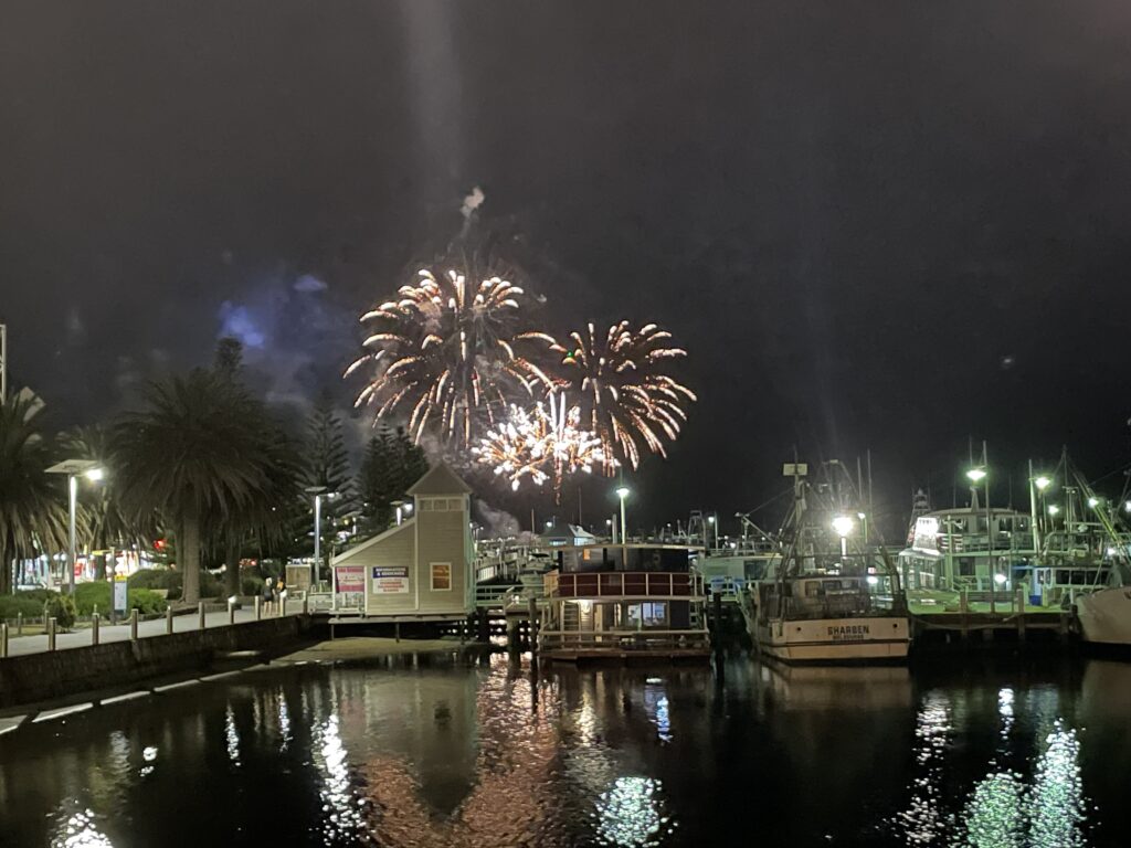 Det var Australia Day – så aftenen blev sluttet af med et festfyrværkeri, som vi oplevede sammen med restaurantens personale. Vi har prøvet at fange lidt af stemningen her: