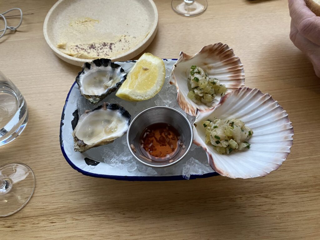 Vi flottede os i går aftes, og blev enige om at tage en tasting-menu på den lokale, gode restaurant. Vi fik fire retter: Først en tallerken med en lokal østers til hver, derudover en lille, delikat kammusling serveret med æble og syltet tang – til det et stykke surdejsbrød med røget smør til. Bagefter kom der en lille ceviche lavet på rød gurn (Gurnard) med grønne tomater og macadamnødder. Den blev fulgt op med en grillet blæksprutte-arm, der blev serveret med grilled blomkål og chorizo. Til hovedretten fik vi en hvilling serveret på en anretning af røget majskorn i hvid balsamicosovs. Til det fik vi tre glas hvidvin – først en lokal prosecco, så en lokal riesling og endelig en lokal chardonnay.