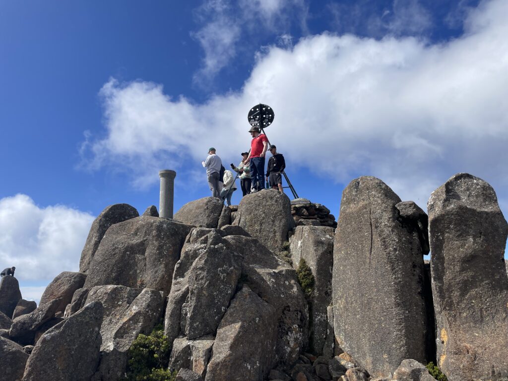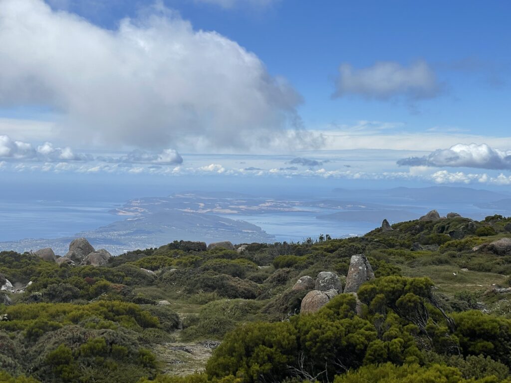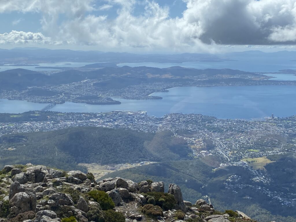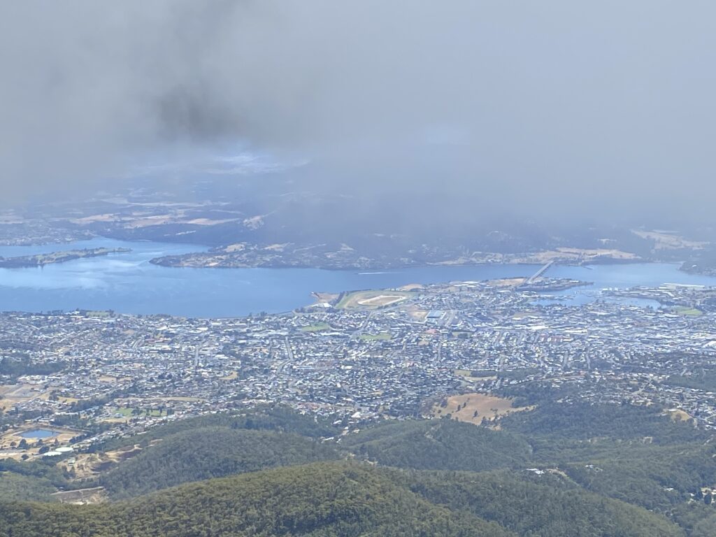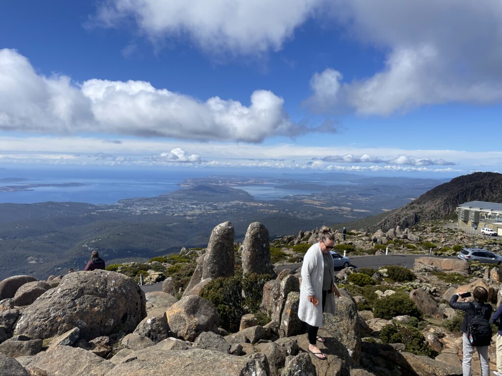 Dagens program startede med en tur op på toppen af Mount Wellington. Erik og Sally ville meget gerne vise udsigten deroppe fra. Det var fint med en lokal chauffør, jeg var aldrig kommet derop i bil. Turen op er 10 km lang, og nogle steder føles det at vejen er lidt snæver, med den turisttrafik, der er. Men hold da op, hvor udsigten var turen værd! Toppen er 1.271 m over havet, og man ender oppe på et stort plateau, hvor der er parkeringsplads og toiletter, et trigonometrisk fixpunkt og en kæmpe radio/tv-mast.