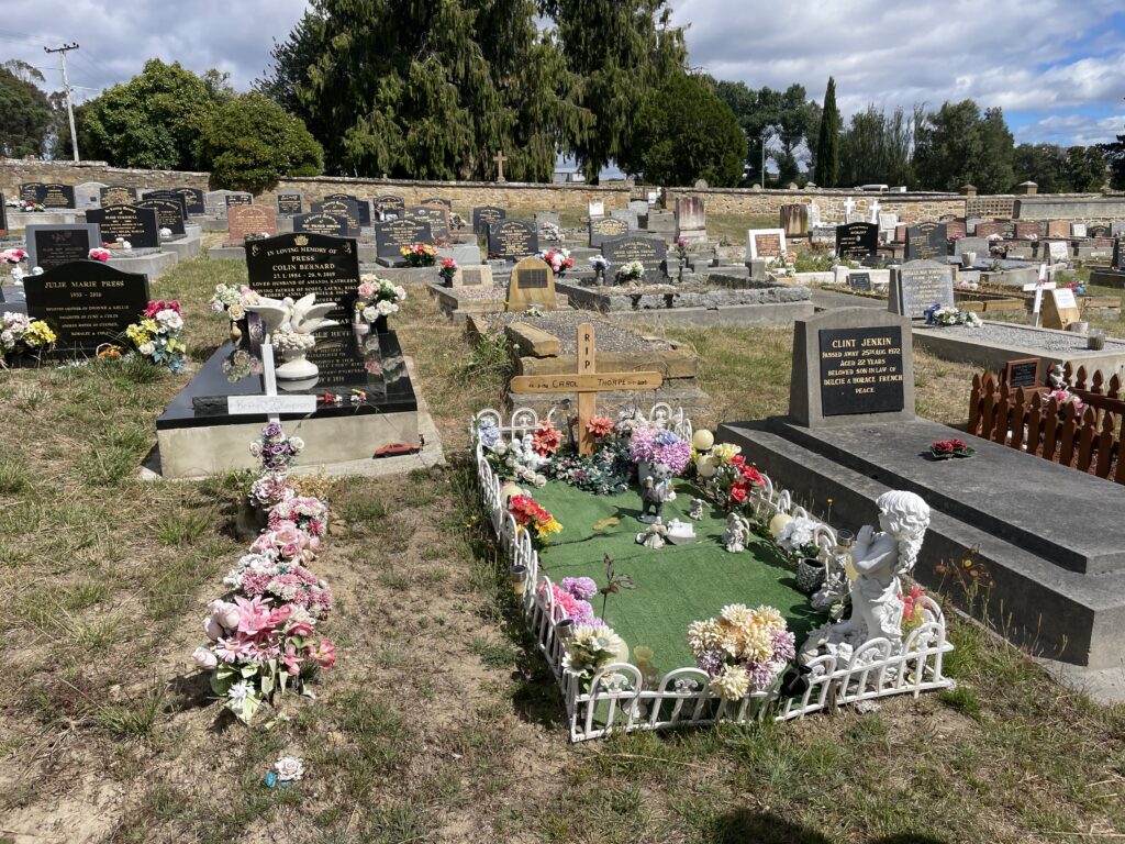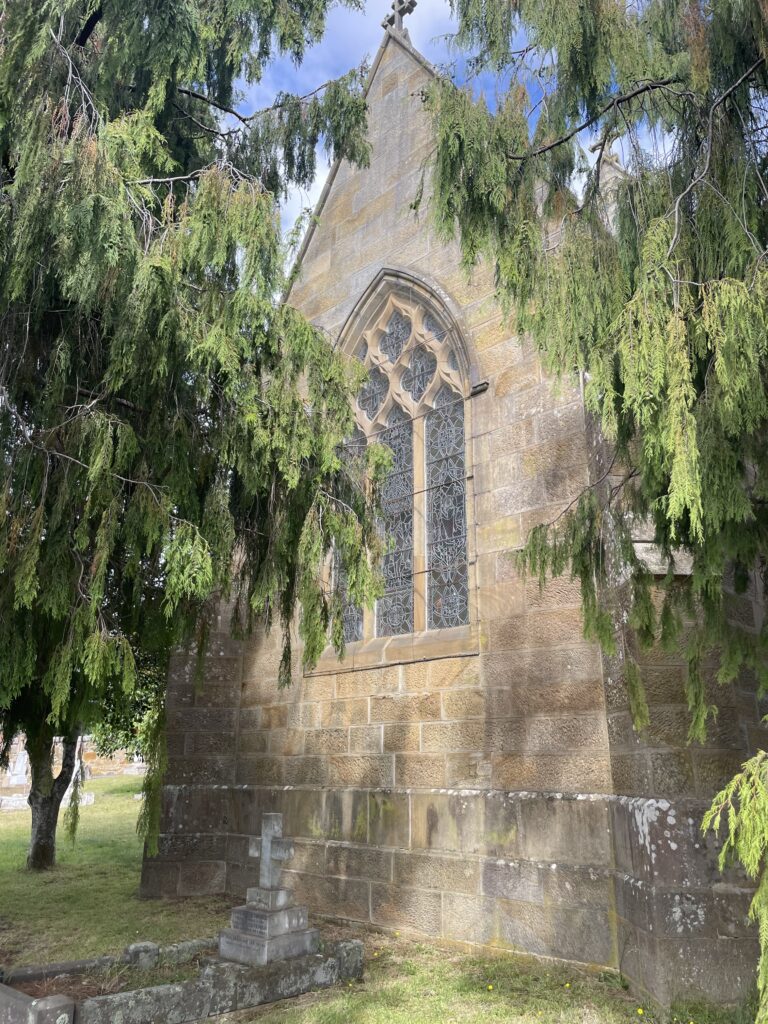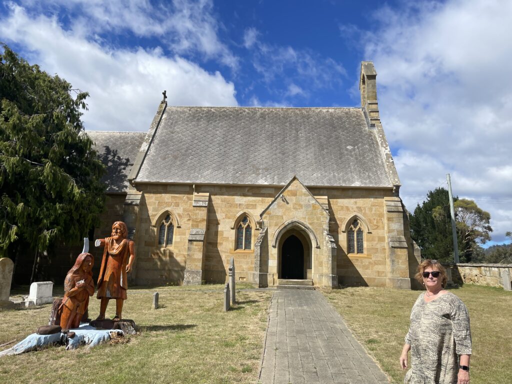 Vi kørte igennem byen Sorrell, som vi tænkte vi måske skulle undersøge lidt nærmere. Men det viste sig hurtigt at være lidt uinteressant. Næste stop var en lille flække kaldet Buckland, hvor der var en gammel kirke – her i landet betyder det, at den er fra tiden før 1850. Den var faktisk smuk. Vi kunne desværre ikke komme ind, men så gik vi en tur på kirkegården for at studere, hvordan man gør her på øen. Det var interessant og anderledes.