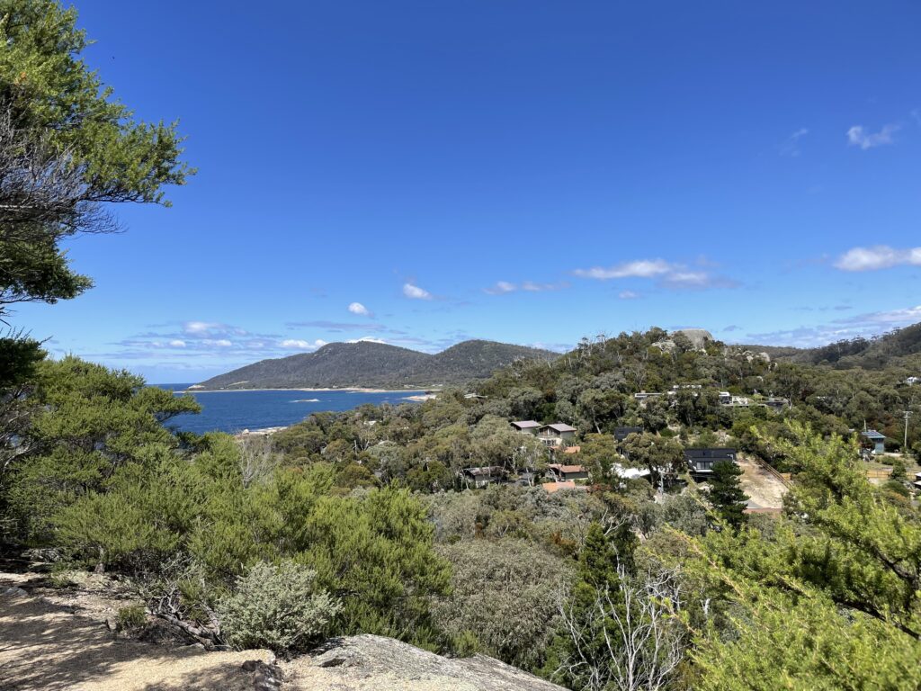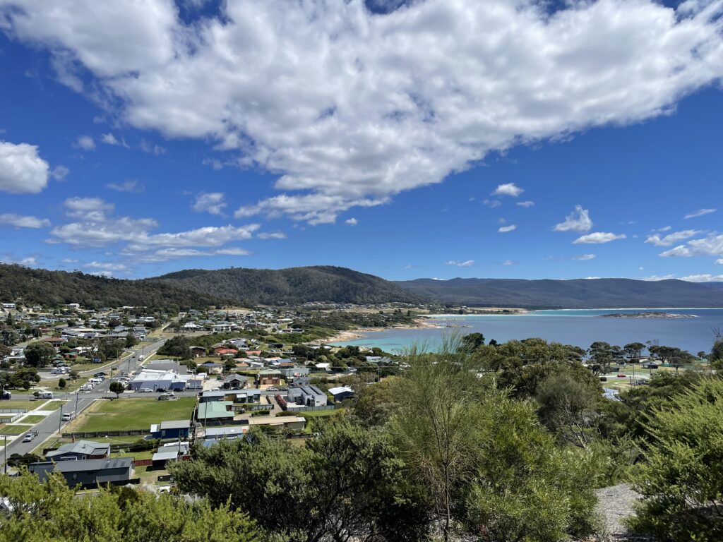 Fra Coles Bay kørte vi tilbage til Bicheno. Vi havde aftalt, vi skulle gå op til whale spotting punktet. Denne by har også haft hvalfangst som indtægtskilde i 1800-tallet, og dette punkt på den lokale høj blev brugt til at spotte hvalerne ude i bugten, når de passerede forbi på deres vandringer fra syd mod nord eller omvendt. Vi nåede ikke helt derop – det var ikke lige så fremkommeligt, som ønsket. Men vi fik en fantastisk udsigt ud over vandet på begge sider af Bicheno.