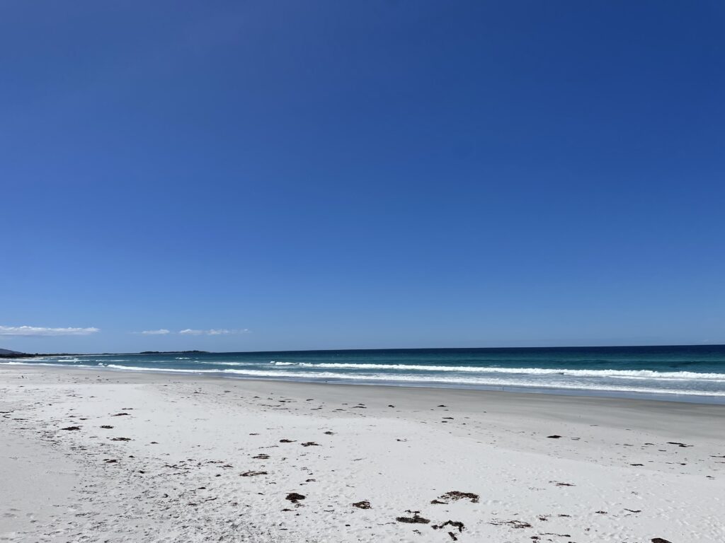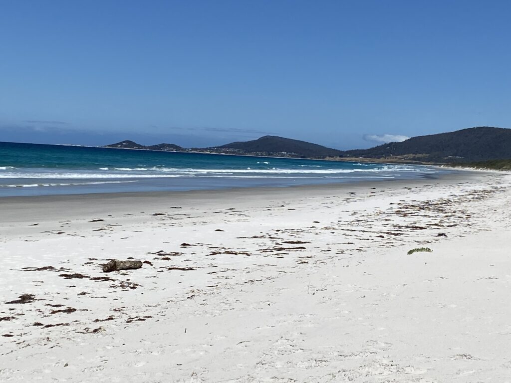 Efter frokosten fortsatte vi mod nord, hvor målet var St. Helens. Undervejs stoppede vi bl.a. ved den flotte hvide strand nord for byen ud til MacLean Bay. Strandene her på øen er bare vildt flotte, og der er som regel ikke et øje! Her mødte vi dog et enkelt par, der også skulle ned og se på vandet.