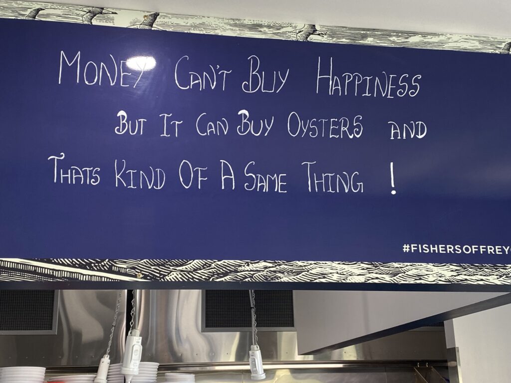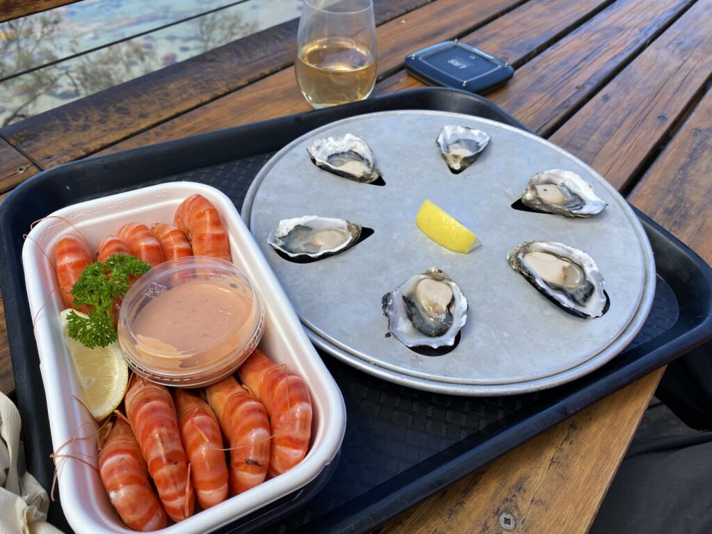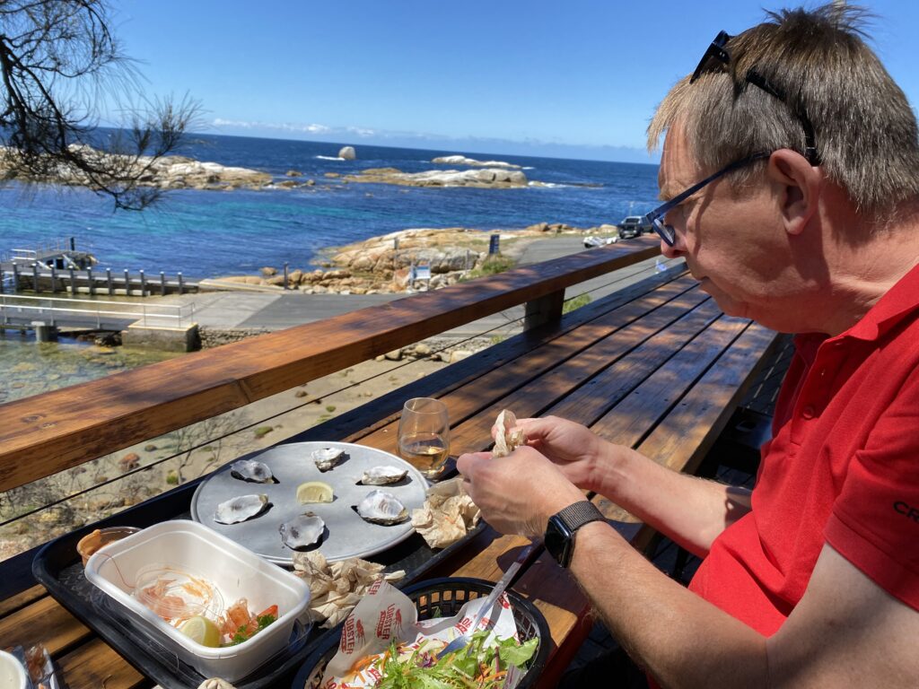 For at følge op på dette fine udsagn, besluttede vi os for at teste de lokale østers til frokost. På Lobster Shack i Bicheno købte vi seks til at dele, nogle australske tigerrejer og en gang salat. Vinen var en Pinot Grigio fra Swansea. Så det var lokale varer. Det hele blev nydt i solen, mens vi sad og så og hørte på måge- og ternekolonien på klipperne ud for havnen. De kunne lave ret god lyd, skal jeg hilse at sige.