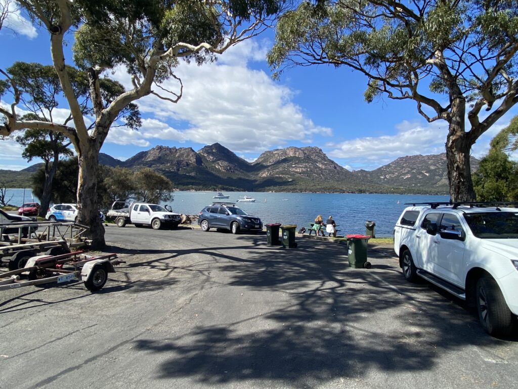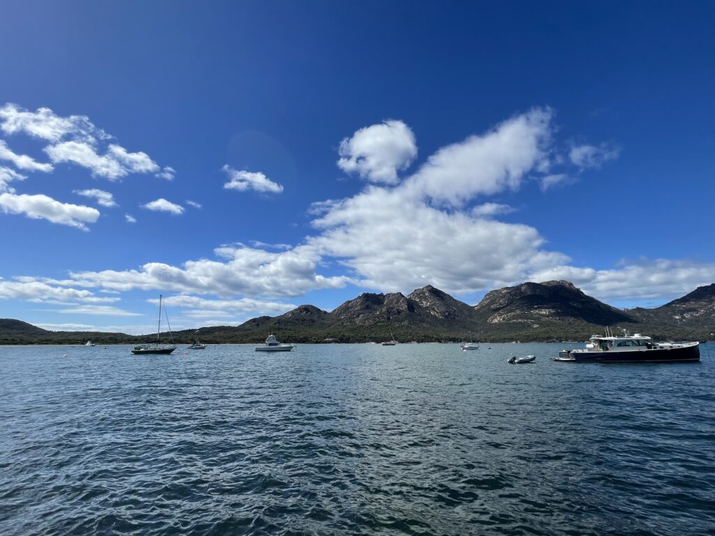Men nu sprang jeg helt over alt det, vi ellers har oplevet igennem dagen. Vi startede dagen med at køre tilbage og ned til Coles Bay, som er et vanvittigt smukt sted, der ligger på kanten af den store Freycinet National Park, der ligger på Freycinet-halvøen. Her stoppede vi ved båderampen, og fik vores formiddagskaffe. Et vanvittigt smukt sceneri. Hvis man er til vandreture i det vilde, byder nationalparken så vidt vi kunne se, på flere muligheder. Vi nøjedes med at nyde sceneriet.