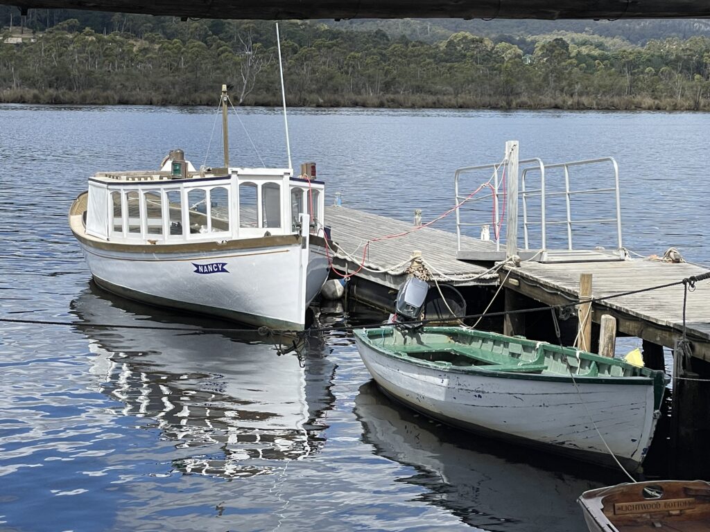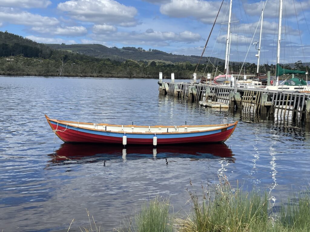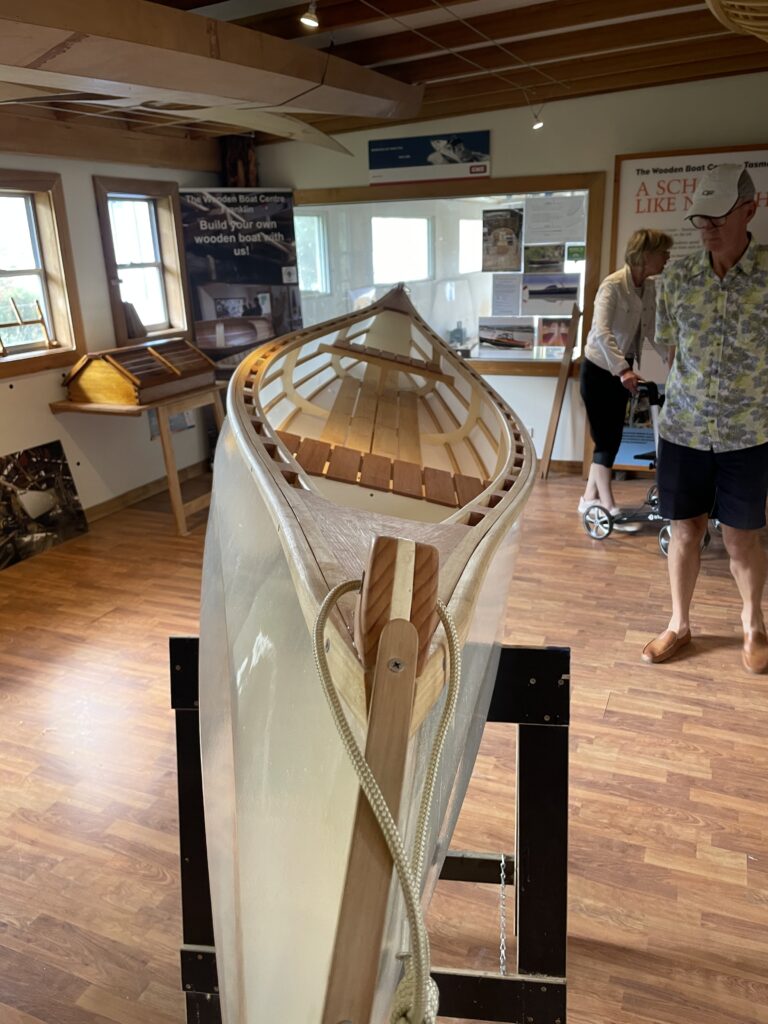 Efter frokost kørte vi videre til Franklin, og the Wooden Boat Center. Centret har eksisteret i 30 år, og er opstået for at videreføre en lang tradition i Tasmanien for at bygge træskibe. Tasmanien har i kraft af sin gamle urskov, nogle træsorter, der er ualmindelig gode til at bygge skibe af, da de ikke angribes af pæleorm eller råd. Det tager til gengæld flere hundrede år, at skabe disse stammer – så det er ikke en metier, hvor man bare kan udvide forretningen, for der bliver ikke givet tilladelse til at fælde det tømmer, der skal bruges (f.eks. Huon Pine).