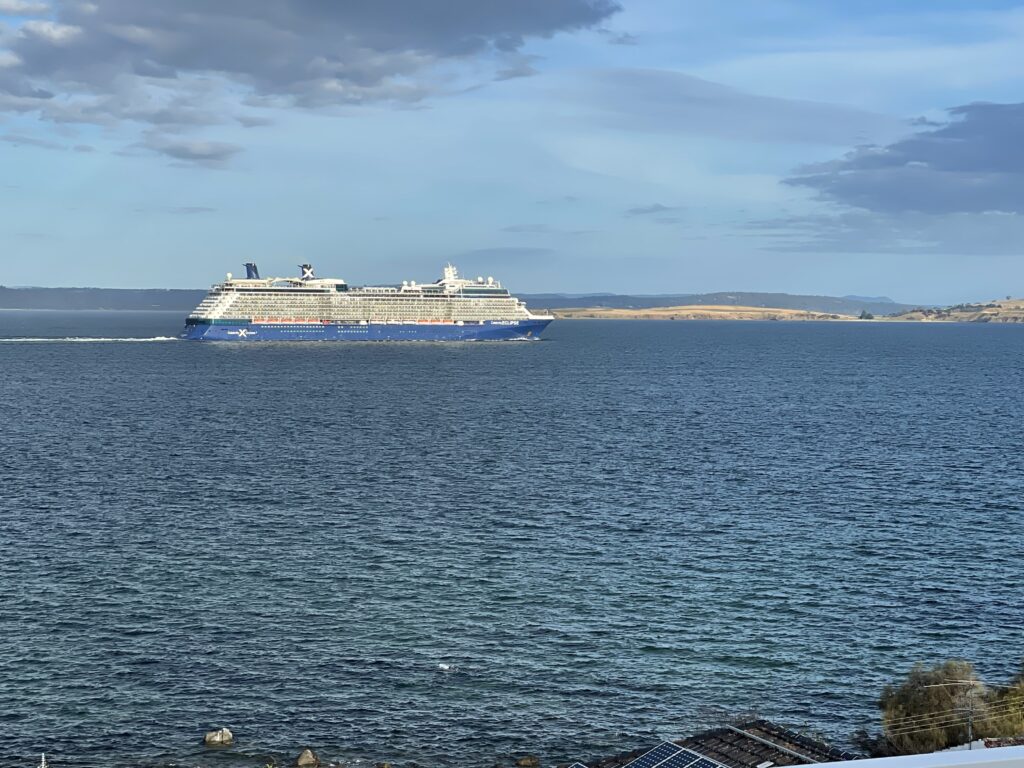 Tilbage i Taroona tog vi en slapper forskellige steder i huset, inden vi samledes på terrassen og nød den forbipasserende skibsfart. Herunder også dagens cruiseship, der var relativt tæt på kysten i dag.