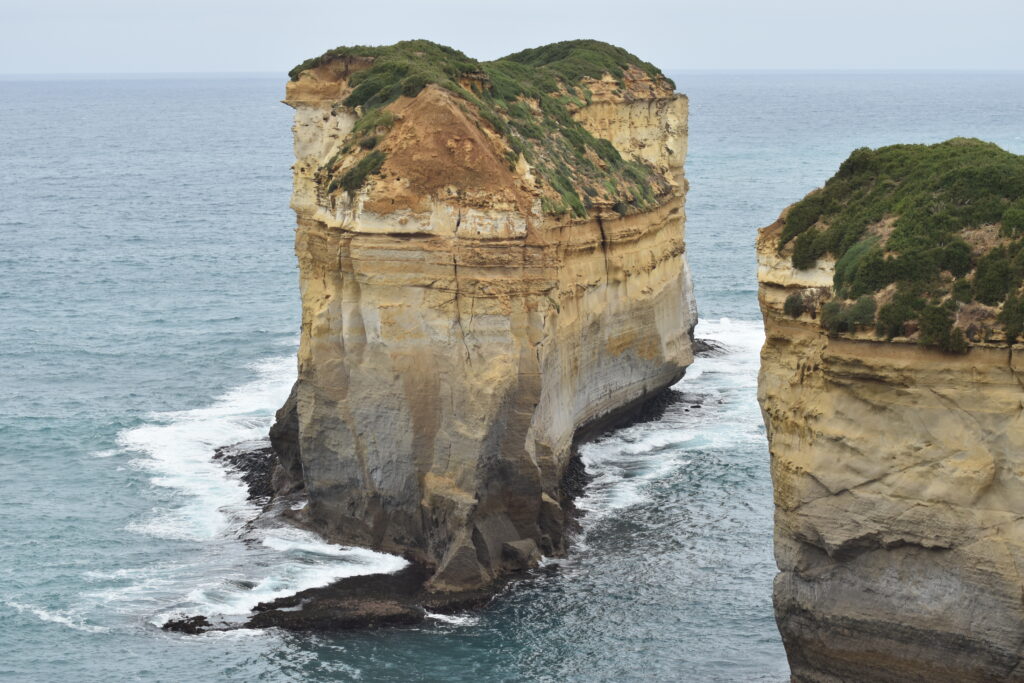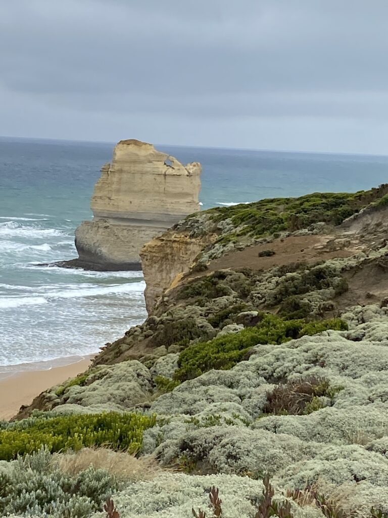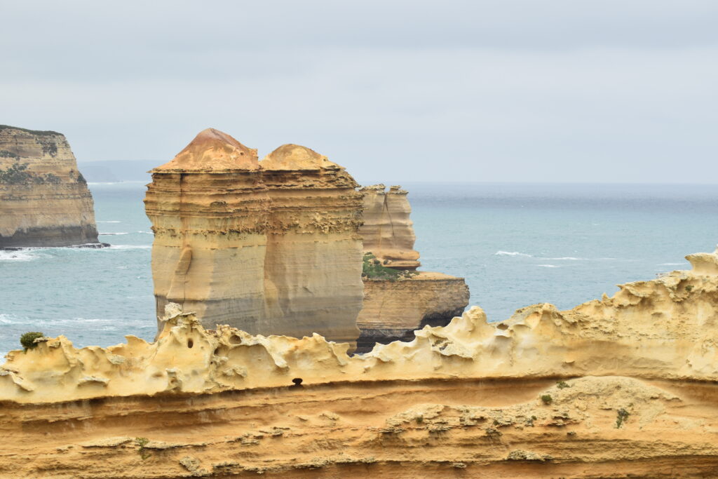 Et mål for dagen var en række steder, hvor man kan se, hvordan havet har skåret sig ind i sandstensskrænterne, og har dannet flottet figurer i landskabet. Lidt ligesom den tidligere Skareklit i Nordjylland. Her dog i væsentligt større omfang og over en meget længere strækning. Det første sted er de såkaldte tolv apostle. Der er kun otte tilbage, idet havet har slidt de andre ned. De er op til 45 meter høje og rager ud foran klinterne, der samme steder når op til 70 meters højde. Det er et meget dramatisk landskab. Lidt af fornøjelsen røg dog, da solen på dette tidspunkt var væk, samtidig med at der kom en ganske pæn vind ind ude fra havet. Så vi måtte finde en trøje at tage på.