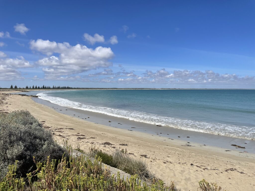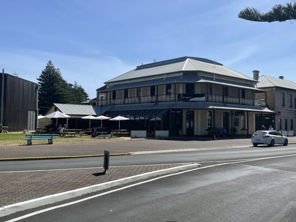 Efter Nelson fortsatte turen i god fart videre. Vi var nu kommet til den del af vejen, der “blot” skulle overstås. Så hver en venlig plet blev noteret undervejs. Herunder Beachport, en lille badeby, der bød på kaffe og kage på byens gamle hotel. Stranden var fantastisk og vandet det skønneste azurblåt.