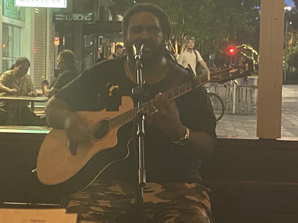 Da vi havde ordnet det vi skulle fandt vi et hyggeligt spisested med levende musik. Der var hyggeligt og afslappet. Ellers ligner Cairns i visse henseender de bedste turiststrøg i Alcudia eller på Gran Canaria. Det er en rigtig badeby. Midt i deres strandpromenade har de også anlagt et temmelig stort friluftsbad, som er fint besøgt.