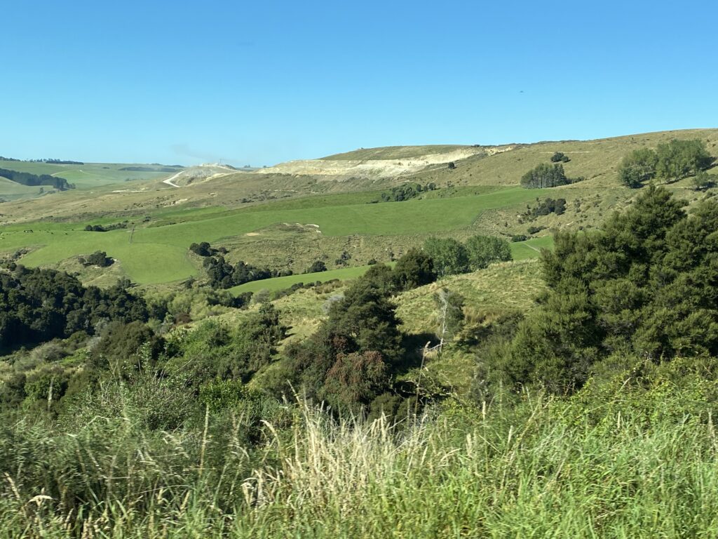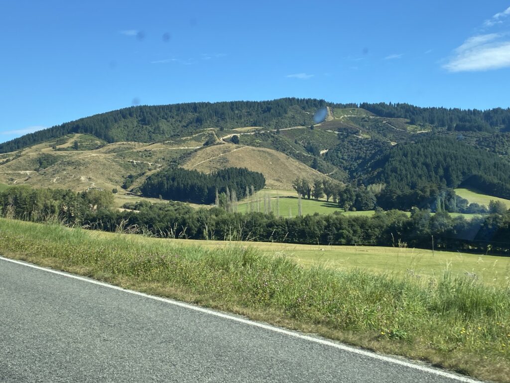 Vores første mål i dag var Lake Tekapo. Og lige så snart vi forlod Geraldine, forlod vi også den lidt monotone natur vi havde set på i går. Nu var det bakker og bjerge. Helt anderledes end i AUS, men så absolut smukt på sin måde. Her er mere råt. Bevoksningen er meget forskellig. Her ser man mange nåletræer og andre “nordiske” typer (f.eks. pil). Vejene er en smule bedre – lille smule bredere, hvilket er af stor betydning, når man kører den store camper, som vi gør. Birgit tog et par billeder undervejs fra vores indlagte panorama-rude: