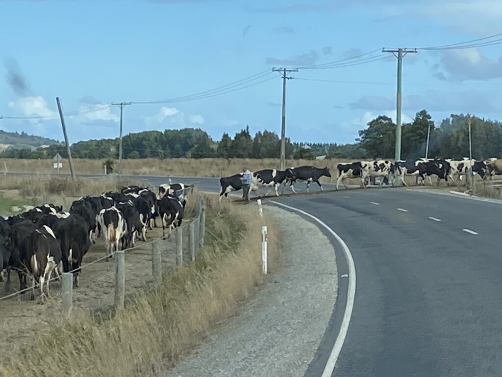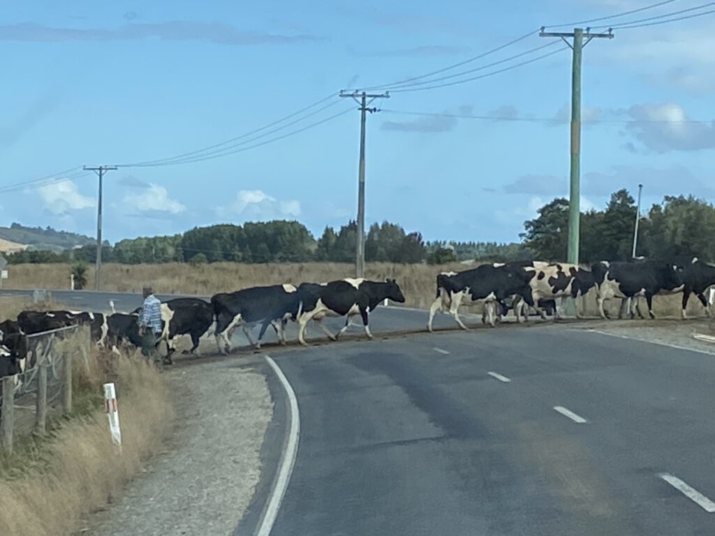 På vejen herned i dag oplevede vi ellers noget typisk for NZ. De store ko- og fåreflokke flyttes ganske ofte. I forhold til hvad vi er vant til at se i DK, så står de utrolig mange dyr samlet på relativ lidt plads. Men det betyder så bare, at de skifter marker lidt oftere. Og i dag var det så en stor flok, der skulle hen over den vej, vi kom kørende ad. Bonden havde utroligt styr på sin flok, og da han synes det var tid stoppede han dem blot og lod os køre igennem. Det skete helt stille og roligt.