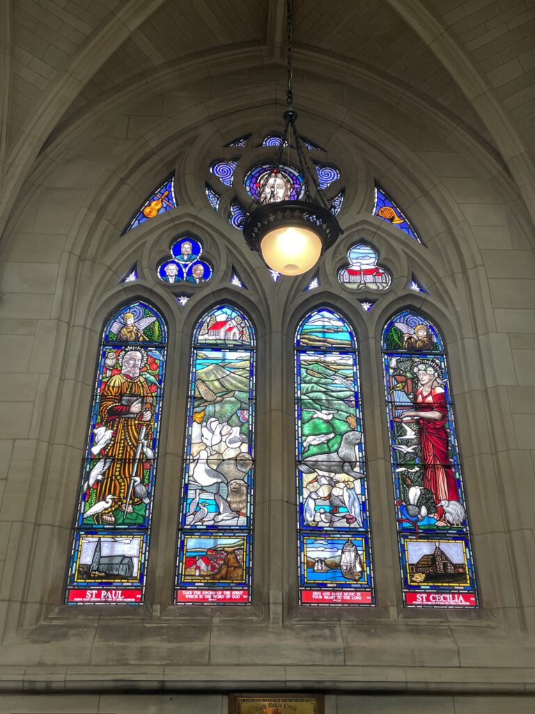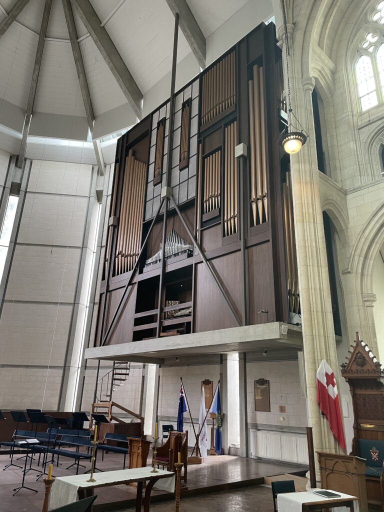 Efter formiddagskaffen gik vi en tur i den store anglikanske kirke. Den er pudsig. Halvvejs opført i gammel stil. Man kan vel sige, de har prøvet at lave en engelsk middelalderkirke. Og så slap pengene op, hvorefter den stod ufærdig i 50 år. Så lavede man en arkitektkonkurrence og byggede et nyt kor op i en helt anden stil. Utraditionelt – og jeg er ikke sikker på, om jeg helt synes det er lykkedes….