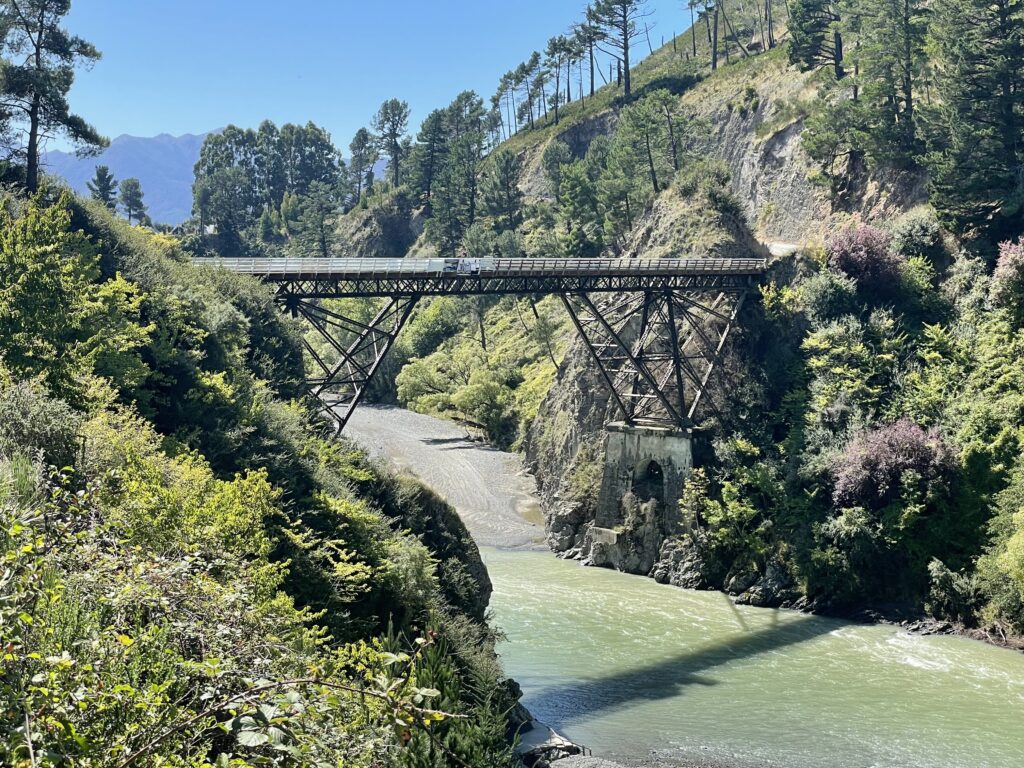 For at komme til byen skal man over en gammel bro fra 1887, der fortsat benyttes. Den erstattede den første bro fra 1864, der blev ødelagt i en storm. Broen er en-sporet, så det er et sted man venter. Og det er den eneste vejforbindelse til Hanmer Springs, så den er vital. I dag benyttes broen også til at udføre bungy-jump fra. Vi så det desværre ikke, men jeg kan godt forestille mig gyset!