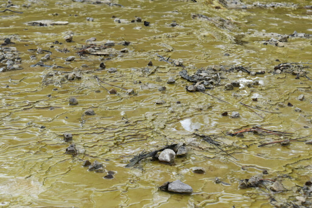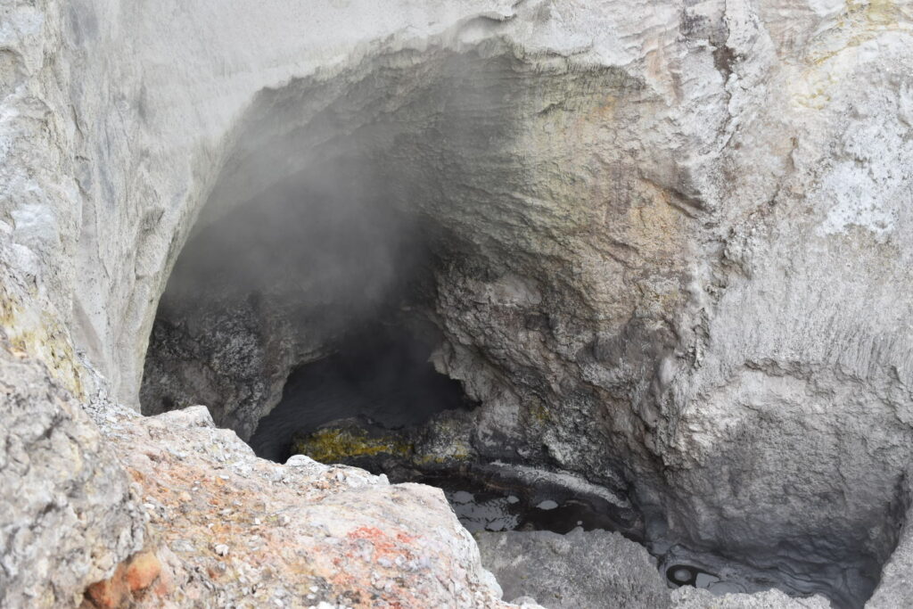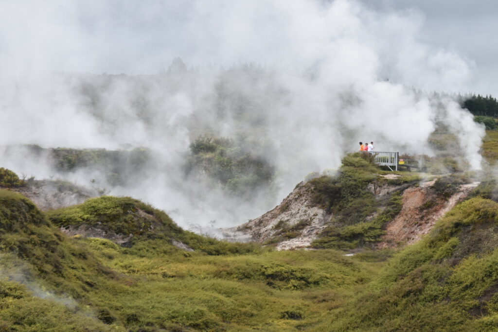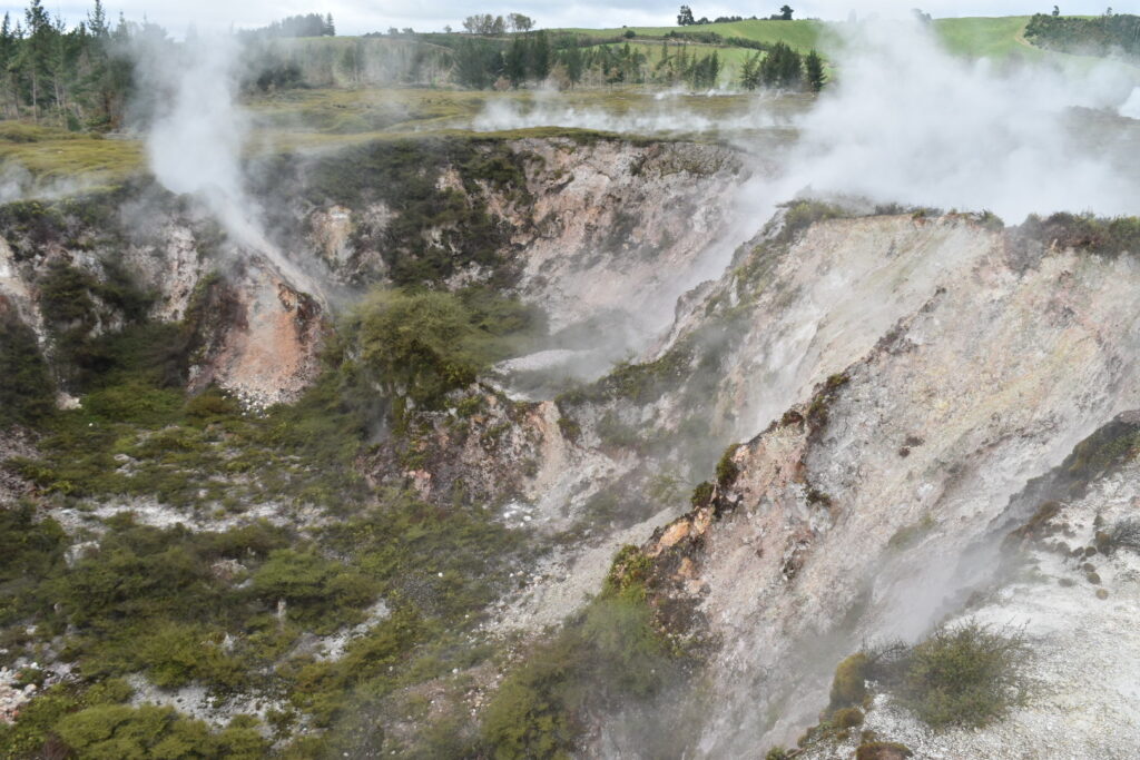 I 1950 startede man med at udnytte de geotermiske energier i området, og det skete som jeg har kunne finde ud af, gennem boringer ned i de varme magasiner. Man hentede derefter varmt vand op herfra, og dermed blev trykket ændret nede i jorden, og tilstrømmende vand fra andre magasiner blev varmet op og blev til damp, som skulle finde en vej ud. Og sådan blev kraterne skabt i 1950. Der skete en ti-dobling af den dampenergi, der skulle op af jorden – og her var overfladen porøs og kunne give vanddampen en vej til overfladen. Den konstante damp har medført at klipperne visse steder er blevet porøse og et kollapset, og det er det man ser i kraterne. I dag er den geotermiske energi dæmpet, så den kun udgør fem gange så meget som i ‘50’erne. Men området ændres løbende, så de boardwalks, der er lagt ud for at publikum kan komme sikkert rundt, en gang i mellem må flyttes.
