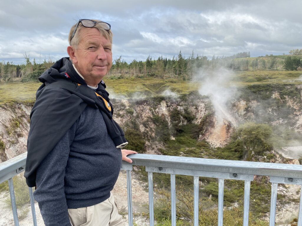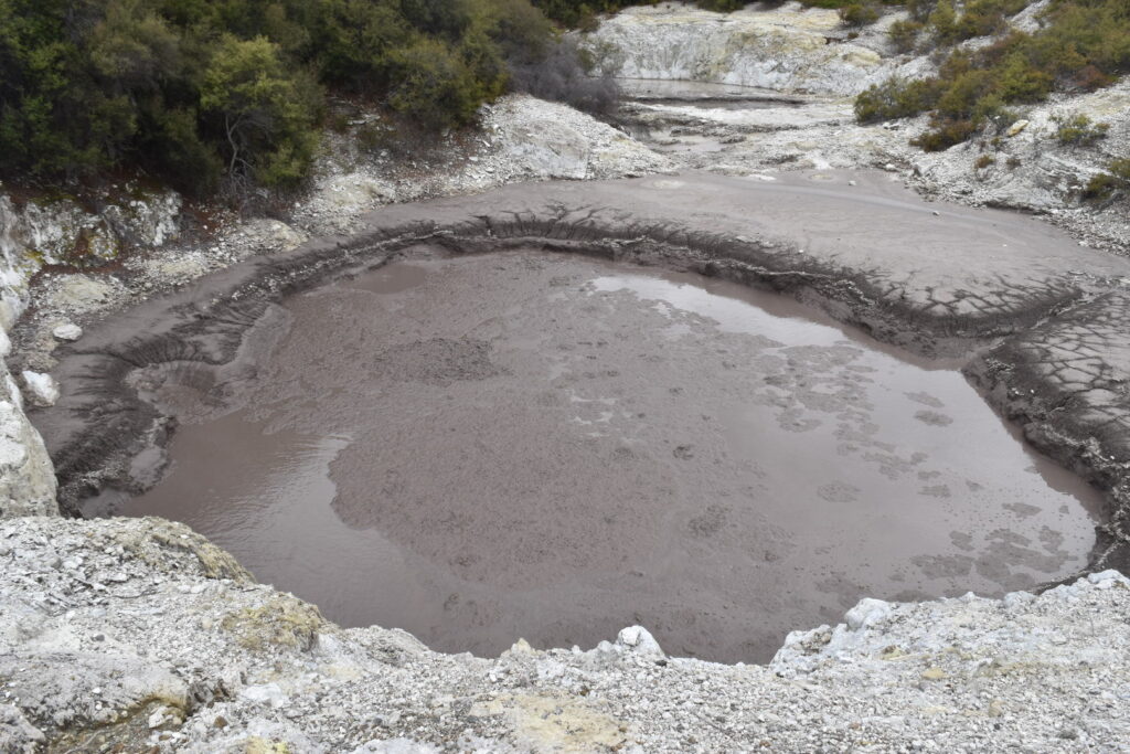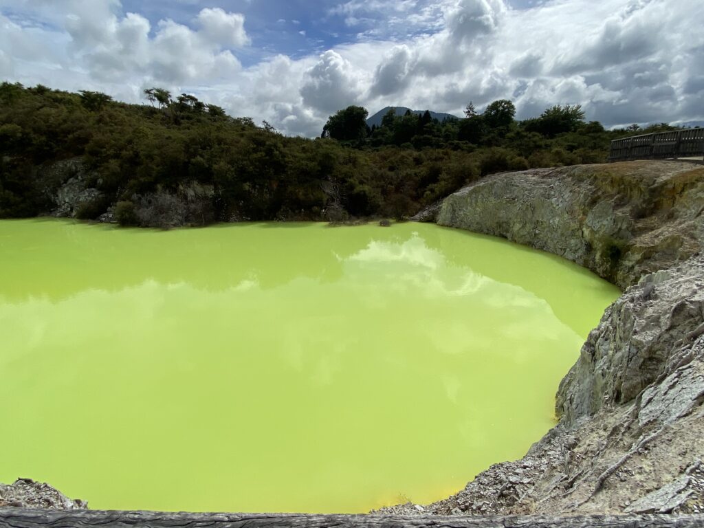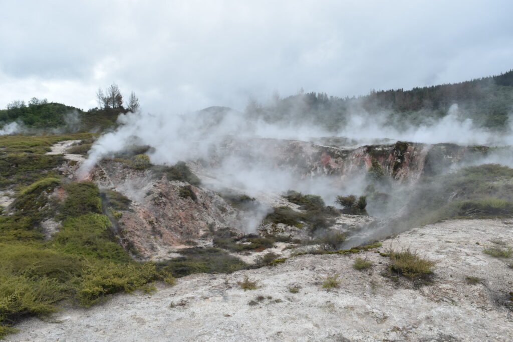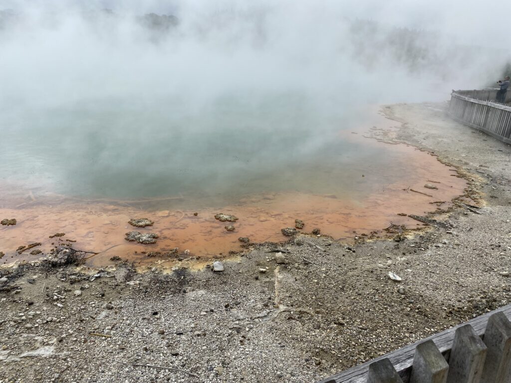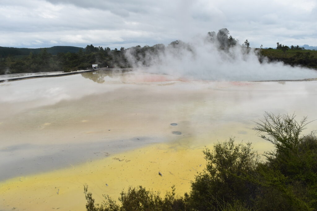 I dette område er det mest vanddamp, der kommer op – så det er ikke så slemt med svovllugt her. Den var der til gengæld i Waiotapu Scenic Reserve, som lå et stykke længere nordpå. Her er det ikke kun vanddamp, der kommer op af jorden. Men kogende vand med mineraler, masser af svovl, jernoxid m.v. Og det betyder, at nogle af de søer, man kan se her bl.a. den store kendte Champagnesøen, viser et utal af farver, afhængigt af vejr og vind, der får de forskellige salte til at samles. Det var en meget fascinerende område – men man skal kunne holde svovllugten ud!