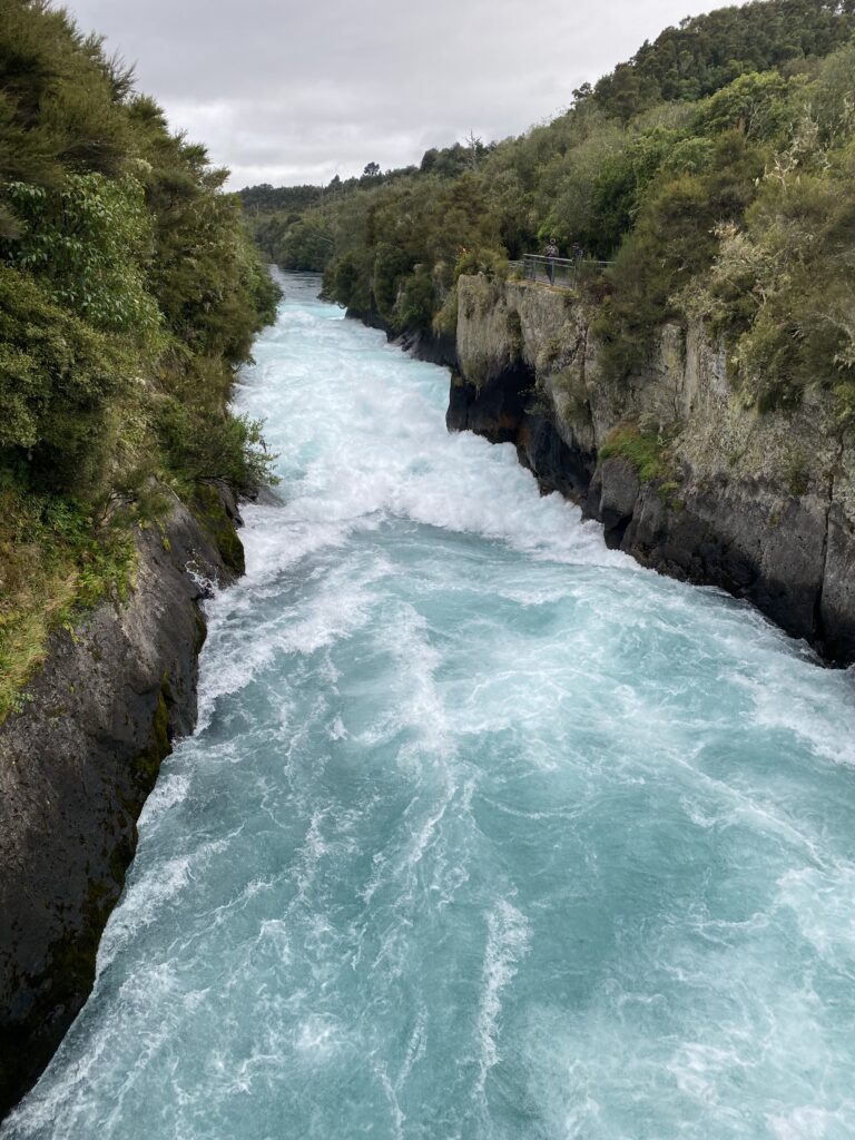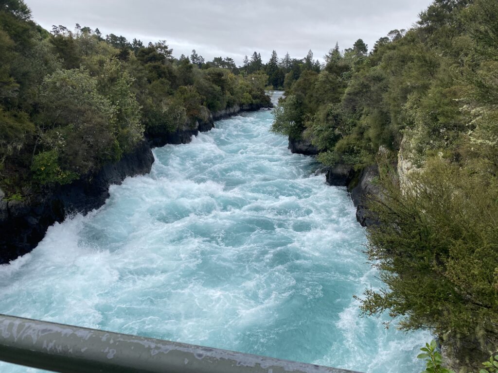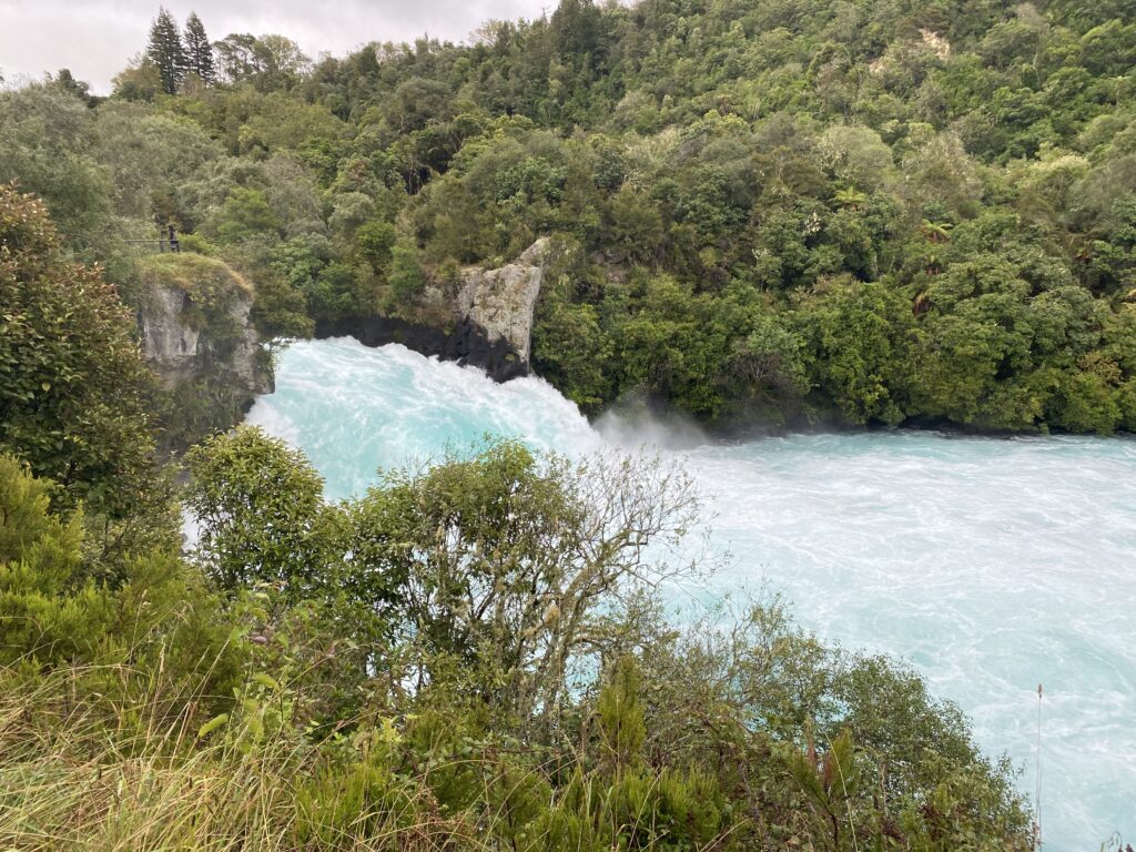 Men dagens første turiststop var nu et med vand – meget vand! Også lissom på Island: 200.000 liter pr. sekund presses igennem løbet, hvor man kan se Huka vandfaldene. Det er helt vildt fascinerende at se det tempo som vandet kommer med, og de kræfter, der bliver aktiveret. Vandet bliver pisket op med bobler, hvorfor det ved faldet får en fantastisk lys blå farve. Helt vidunderligt.
